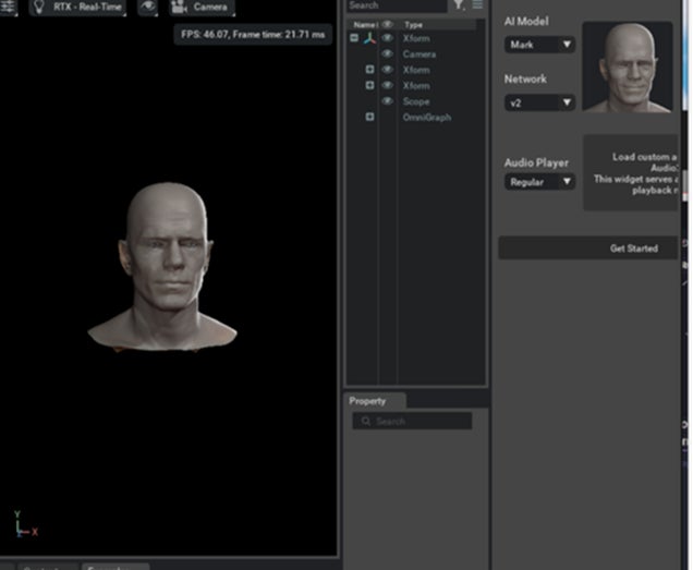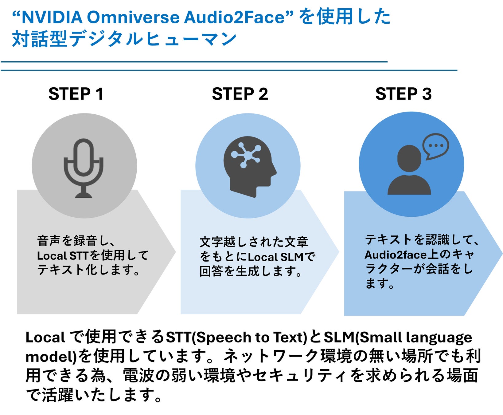 対話型AIデジタルヒューマンのプロトタイプは、ローカルの大規模言語モデル(LLM)を使用して会話音声データを生成、「NVIDIA Omniverse Audio2Face」を通じて会話音声データから自動的に表情豊かな顔のデジタルヒューマンを作成します。