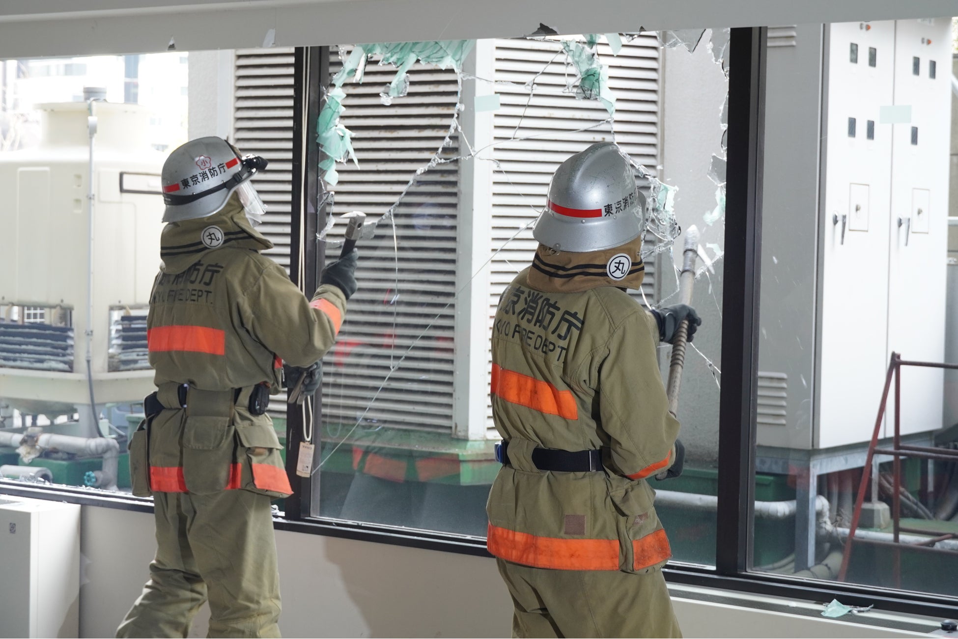 本訓練では、玄関やガラス窓が消防隊の屋内進入の障害になる状況や、火災が発生し屋内照明が消えた事務所内に逃げ遅れ者が発生した状況などを想定し、機材による防火戸・ガラス窓の破壊、暗所での火災対応、建物内への放水など多様な訓練が行われました。実際の建物を活用した訓練機会の提供を通じて、隊員の消防活動技術の向上に貢献しました。