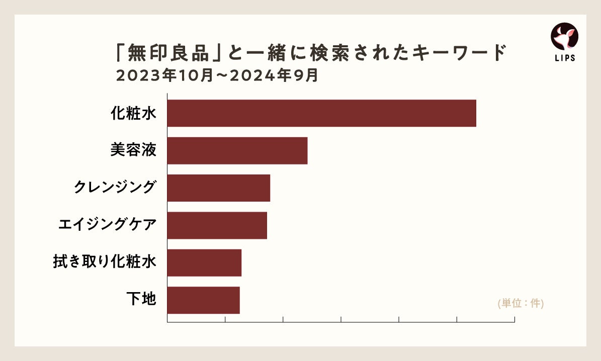 2023年10月〜2024年9月の1年間で「無印良品」と一緒に検索されたキーワードを上位から紹介。定番の化粧水に次いで、美容液が注目されていることがわかります。また、上位5アイテムがスキンケア商品であることから、無印良品=スキンケアに定評のあるブランドとして認知されているようです。