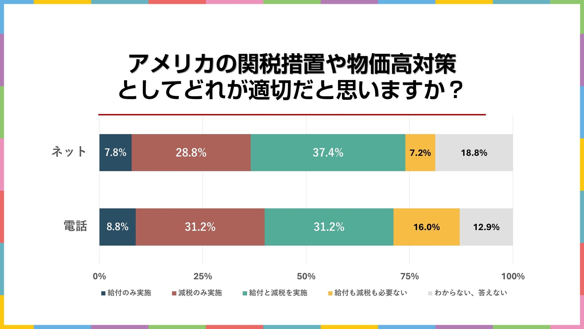 「政府・与党は、アメリカの関税措置や物価高の対策として、国民への現金給付や消費税減税を検討していると報道されています。あなたは、対策としてどれが適切だと思いますか?」と聞いた結果が上の図です。