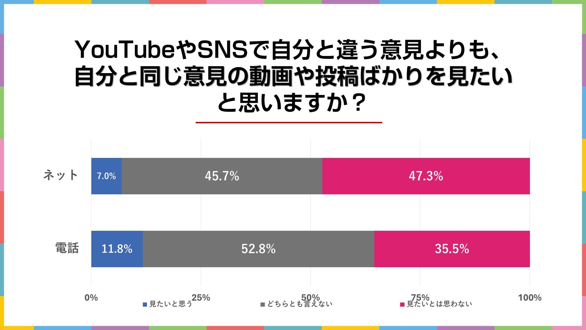 「あなたは、YouTubeやSNSを利用する際、自分と違う意見よりも、自分と同じ意見の動画や投稿ばかりを見たいと思いますか?」と聞いた結果が上の図です。