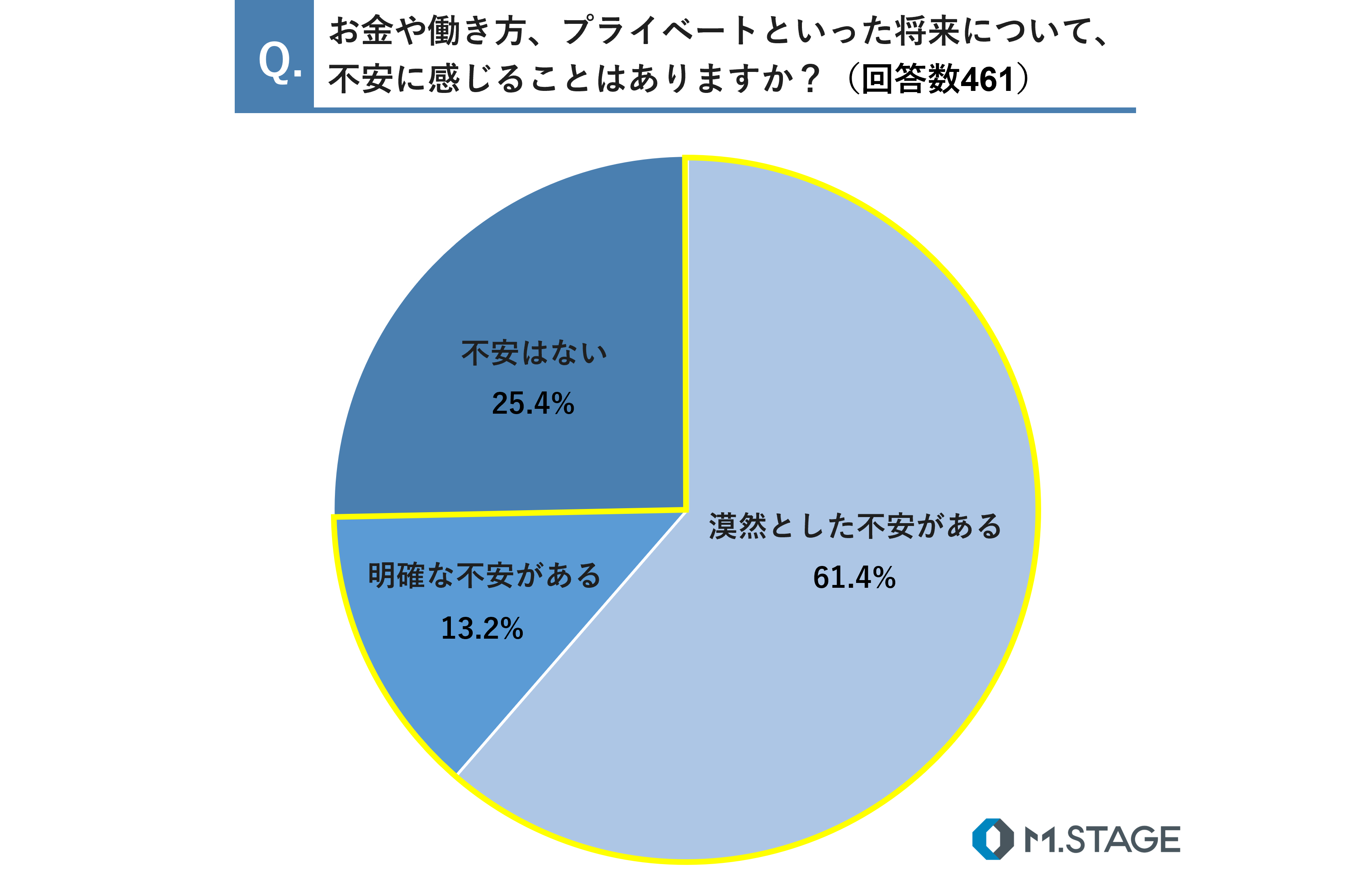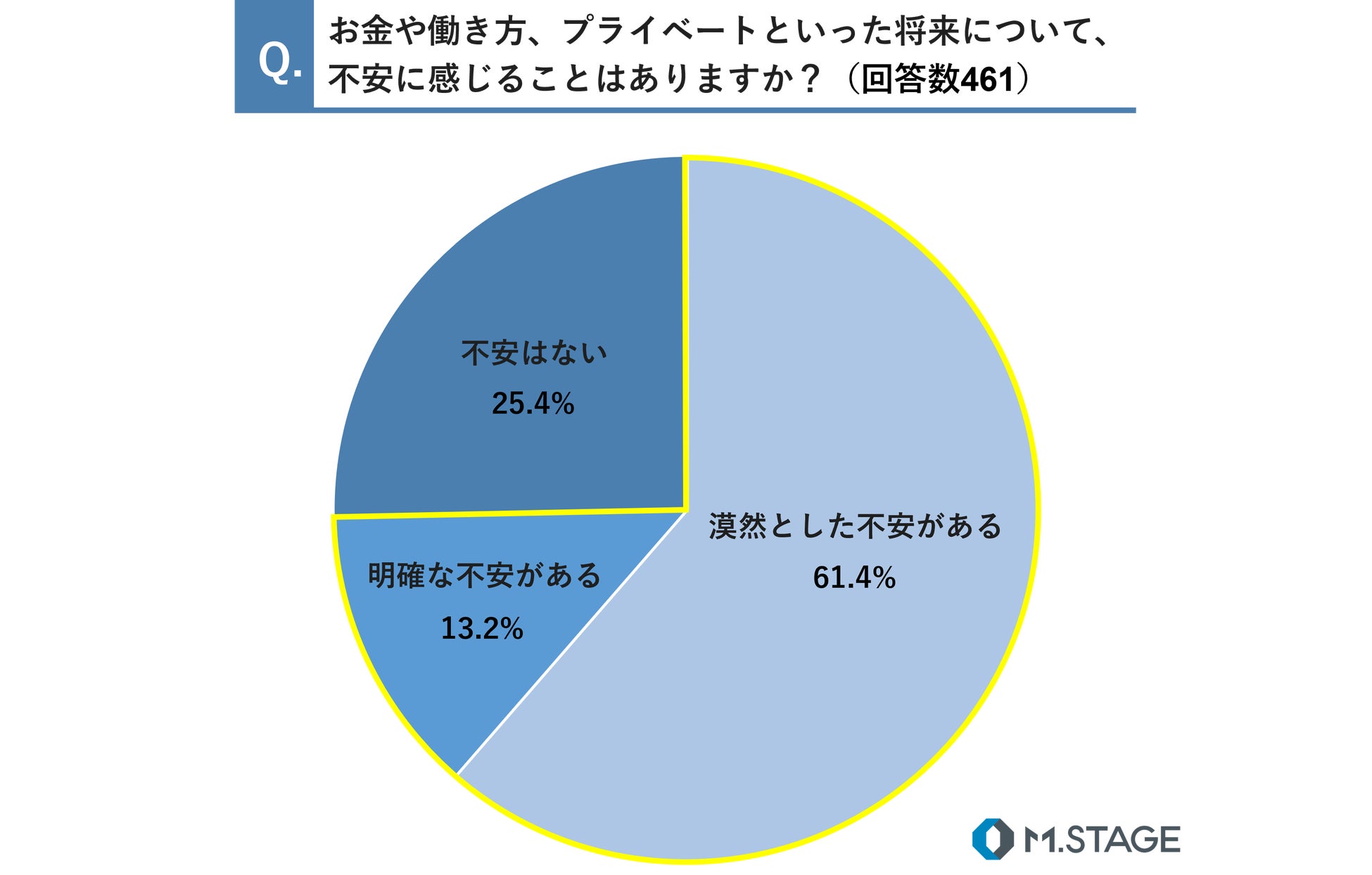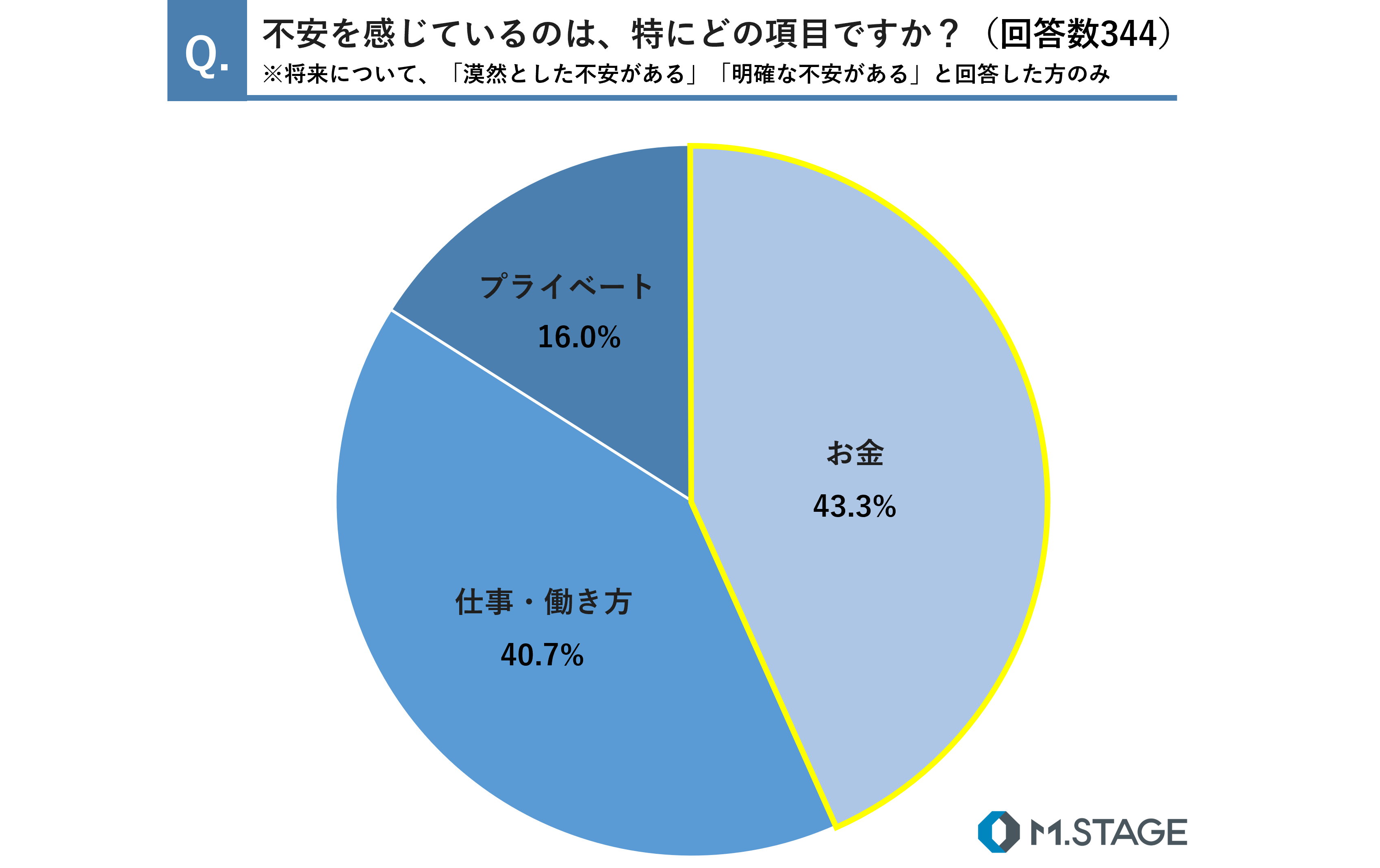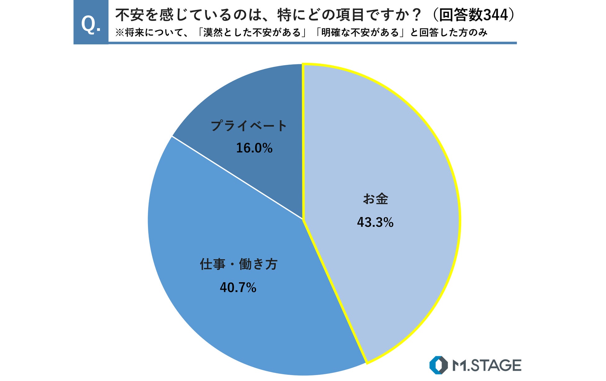 お金や働き方、プライベートといった将来について「漠然とした不安がある」と回答した医師は61.4%、「明確な不安がある」と回答した医師は13.2%となり、74.6%の医師が不安を感じている結果になりました。また、具体的に不安に感じている項目では「お金」が43.3%で最も多い結果となりました。