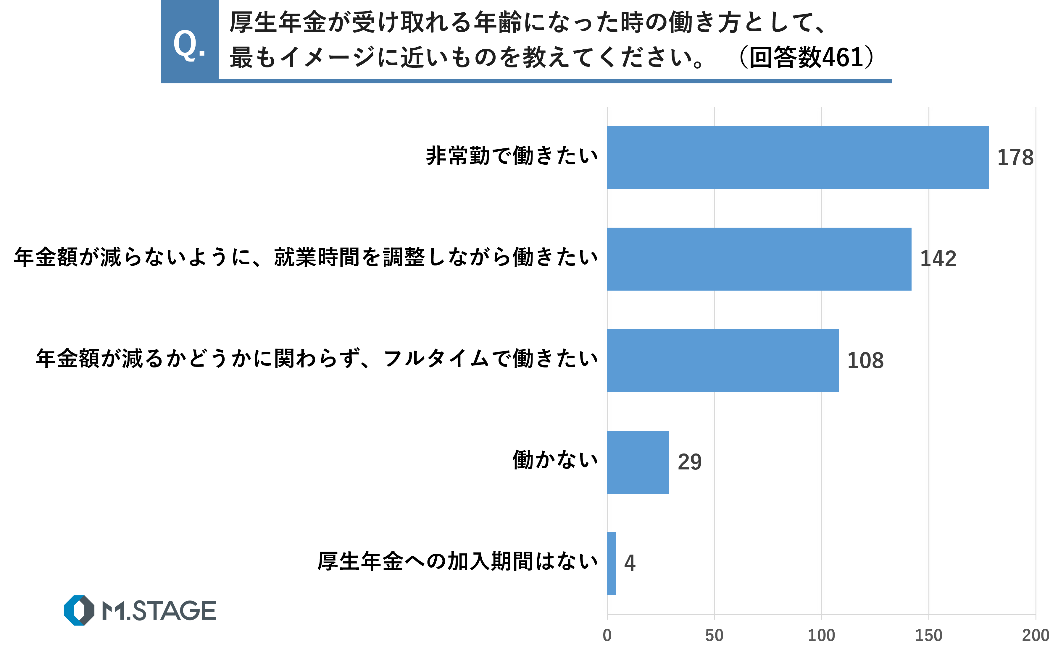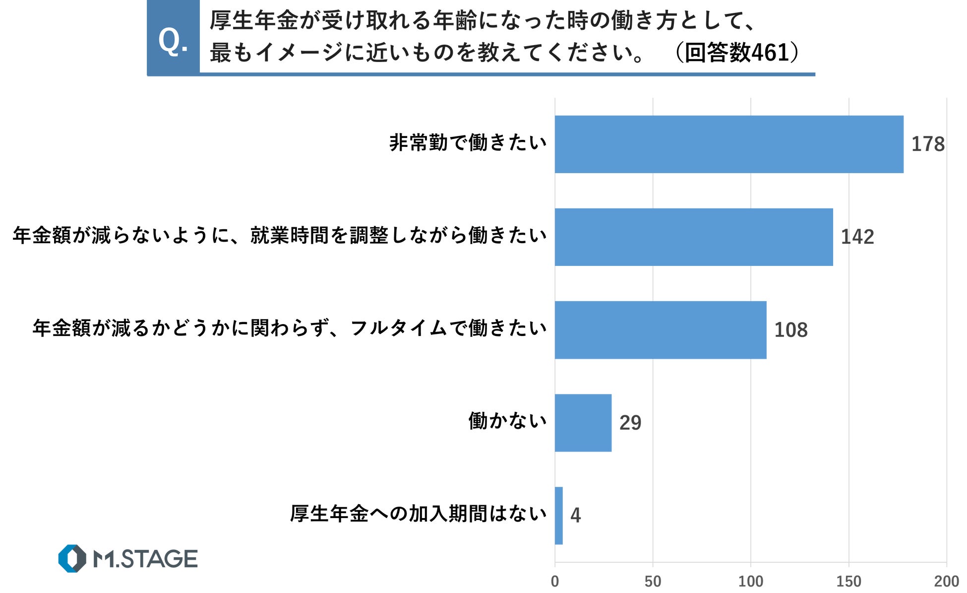 厚生年金を受け取れる年齢になった時の働き方のイメージとして、「非常勤で働きたい」(178)と回答する医師が最も多い結果となり、柔軟な働き方を希望する医師が多いことがわかりました。また、「年金額が減るかどうかに関わらず、フルタイムで働きたい」(108)と回答する医師も100名を超える結果となりました。