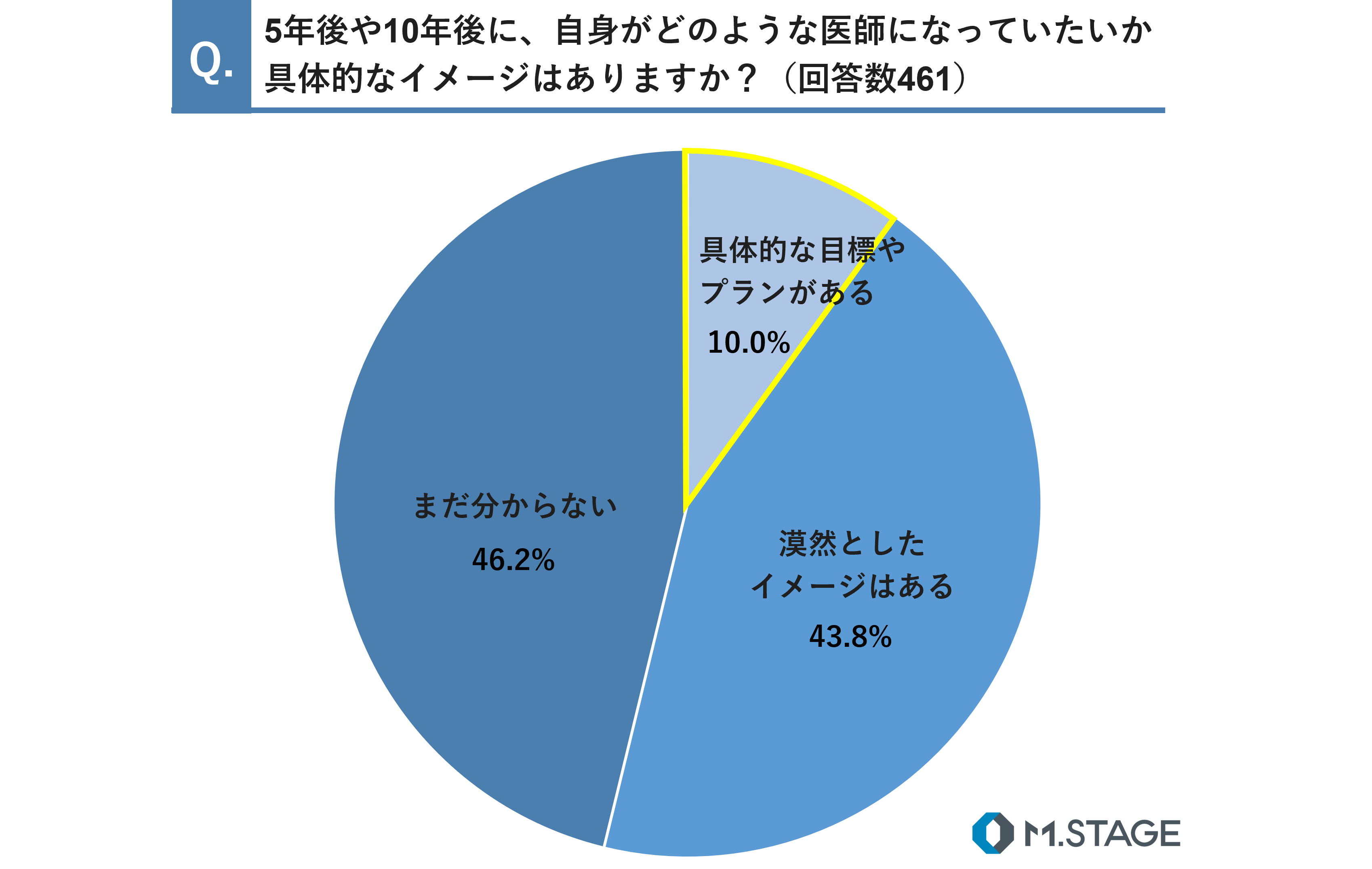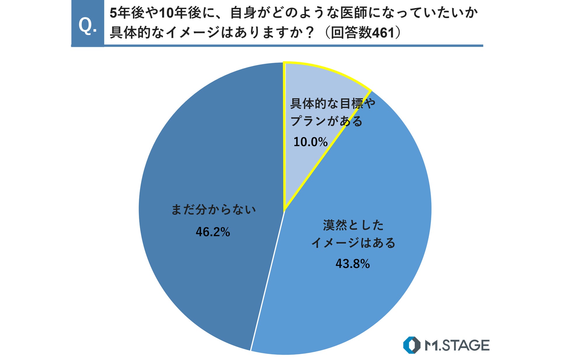 5年後や10年後のキャリアイメージについて、「具体的な目標やプランがある」と回答した医師は10.0%、「漠然としたイメージはある」と回答した医師は43.8%となり、半数以上は5年後、10年後のイメージを持っている結果となりました。