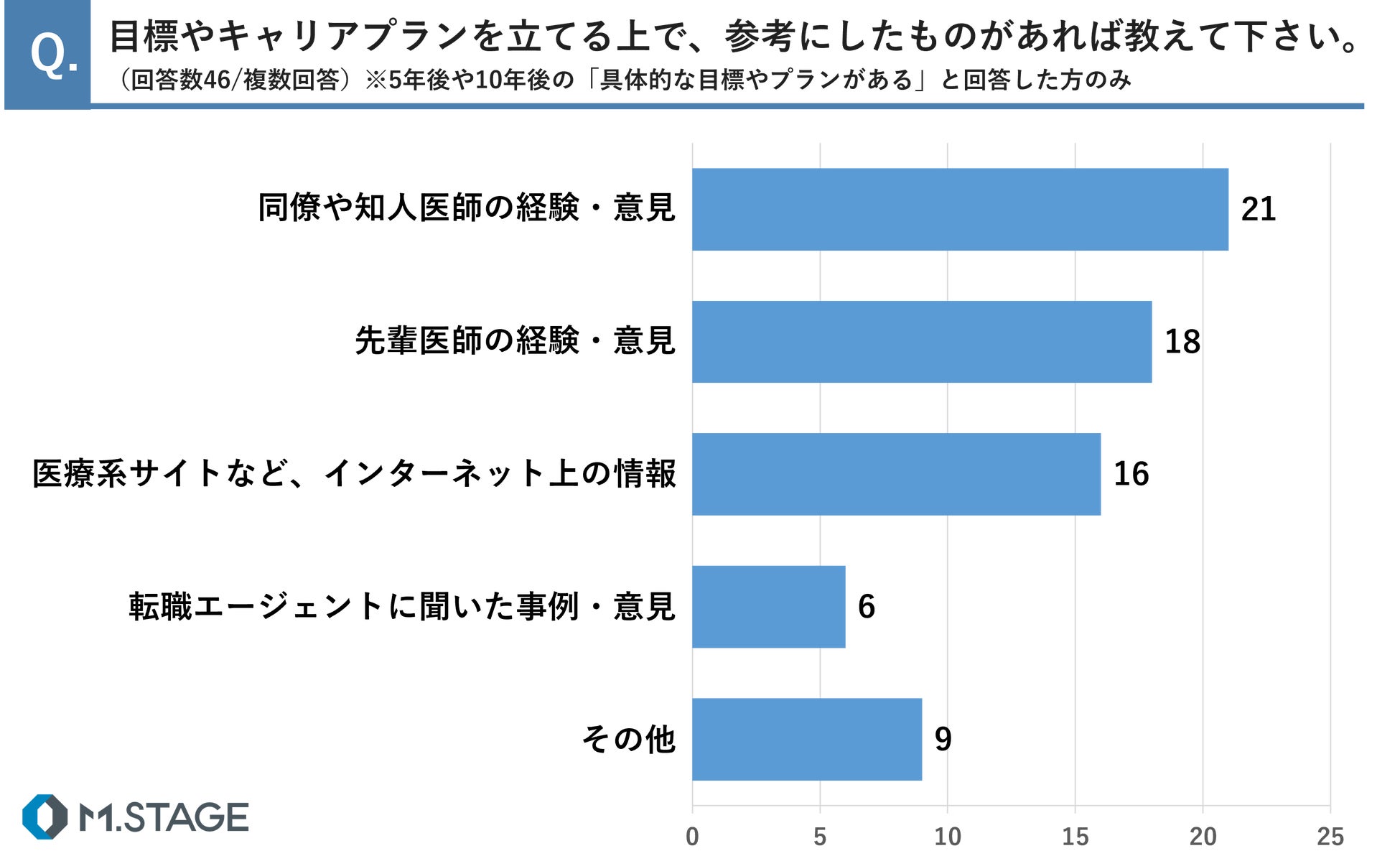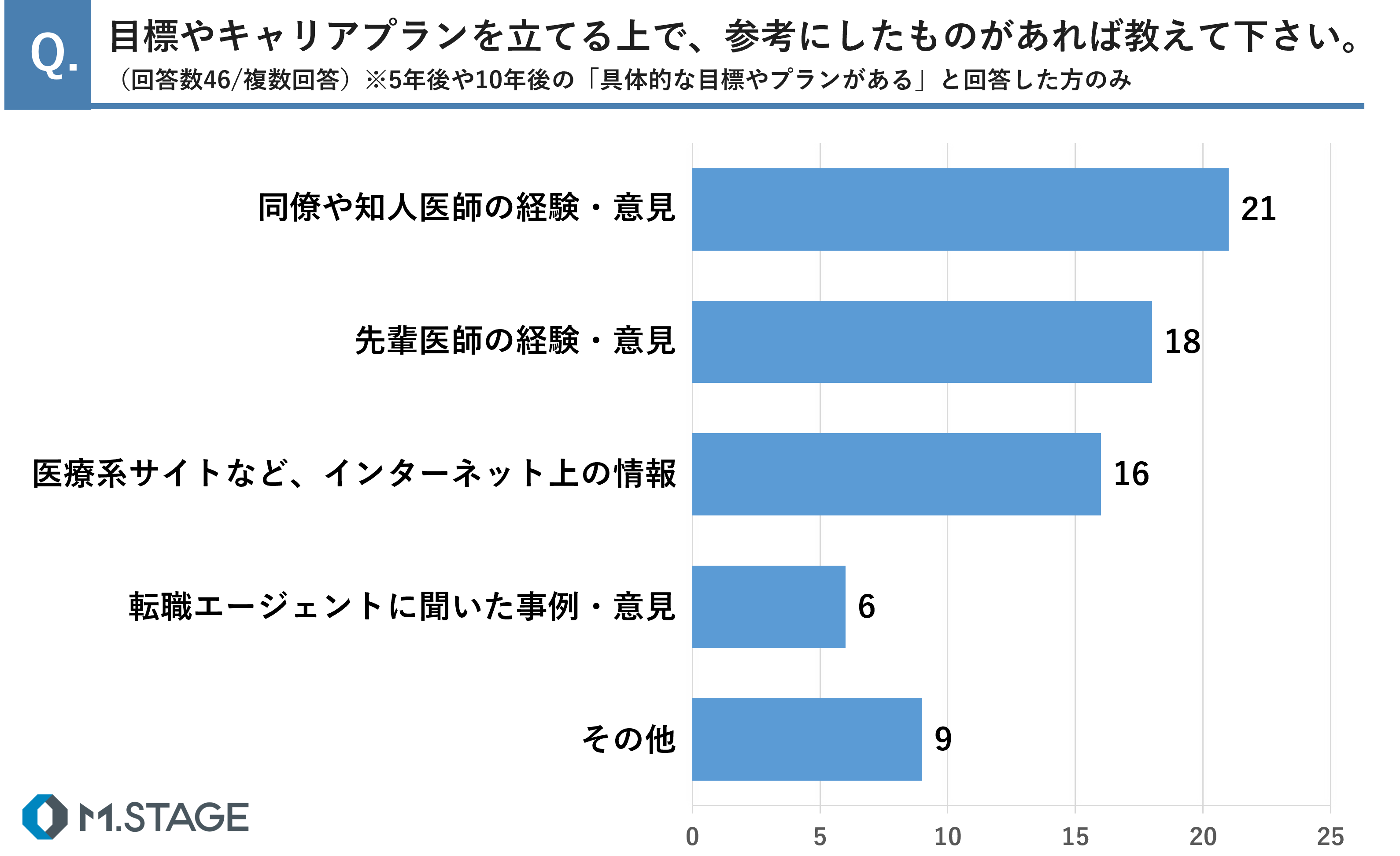また、「具体的な目標やプランがある」と回答した医師が、目標やキャリアプランを立てる上で参考にしたものは「同僚や知人医師の経験・意見」(21)や「先輩医師の経験・意見」(18)などの、身近な人からの情報によるものが多い結果となりました。同様に、「医療系サイトなど、インターネット上の情報」(16)、「転職エージェントに聞いた事例・意見」(6)という選択も一定数あり、インターネットや転職エージェントなどの客観的な情報も参考にしていることがわかりました。