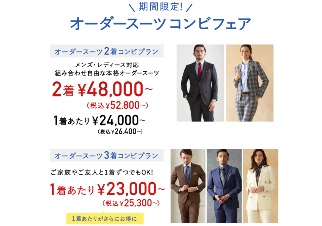 “高い” “古くさい” “入りづらい” などと思われがちなオーダースーツ業界を根本から変えるべく、リーズナブルな価格でのご提供や、ファッション性を重視した豊富なスーツモデルや生地のご用意、お洒落な空間デザインなどの工夫を重ねて、ブランドのコンセプト「ENJOY ORDER!」のもと、オーダースーツを通してビジネスマンの皆様を応援することを追及し続けています。