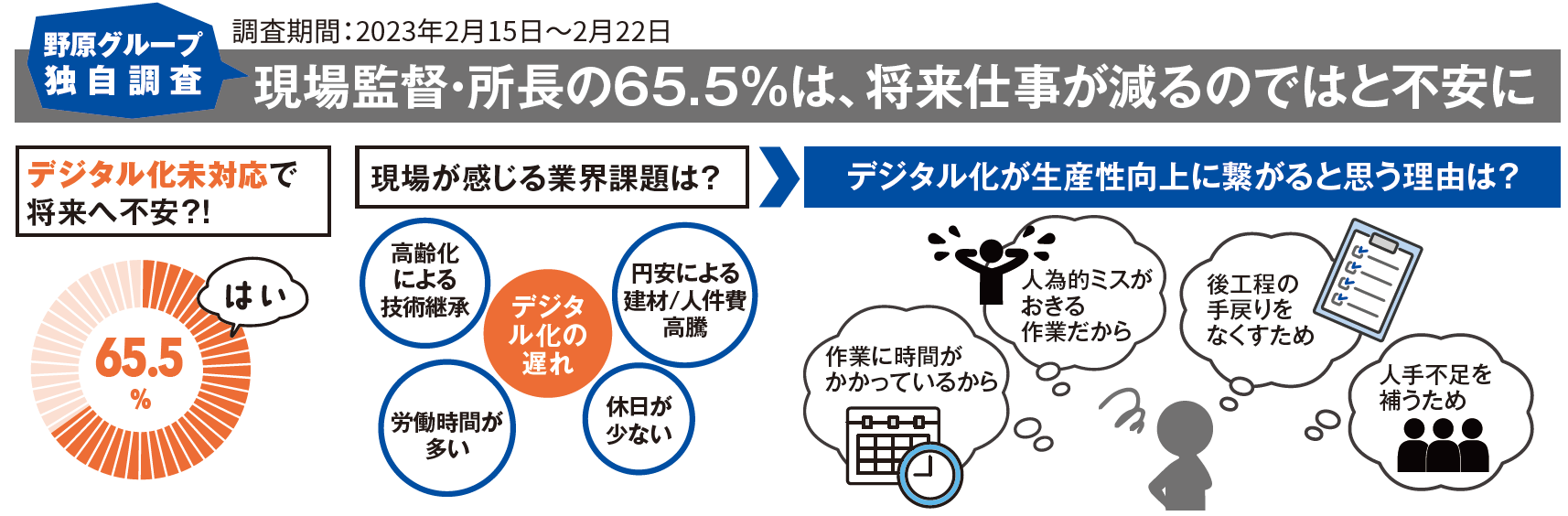 「施工管理」業務を担う現場監督・所長の皆さまが、より強く「人材不足」を業界課題として感じておられること、施工管理や安全管理業務の「デジタル化による生産性向上」に期待をお持ちであることを、本調査結果から改めて認識できました。