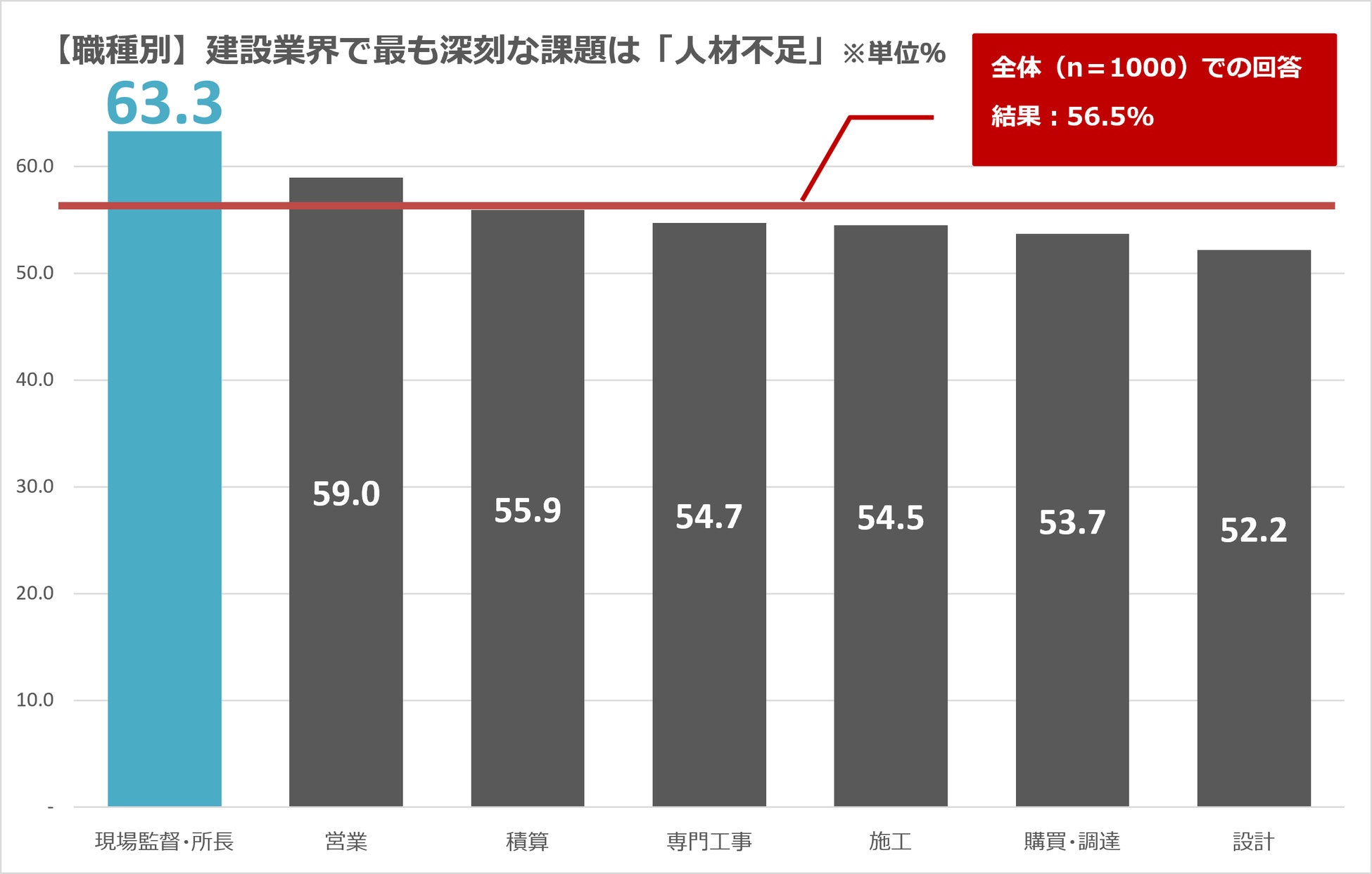 現場監督・所長(現場代理人)が、最も深刻と考える業界課題は「人手不足(63.3%)」で、建設業界従事者1,000名の56.5%を大きく上回っており、他の職種の結果と比較しても突出している。