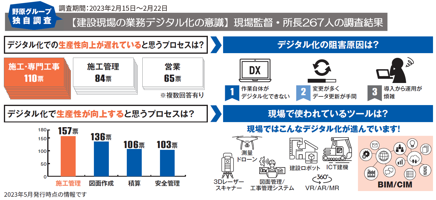 これまでの調査から、「施工管理(工程、安全、品質、原価などの工事に関わる様々な業務の管理)」は、「デジタル化による生産性向上、業務効率化が遅れていると思う業務」第3位(23.1%)、「デジタル化で生産性向上につながると思う業務」第2位(41.0%)に上がっています。この施工管理に深くかかわる職種が、建設工事の元請企業(主にはゼネコン)の「現場監督・所長(現場代理人)」です。