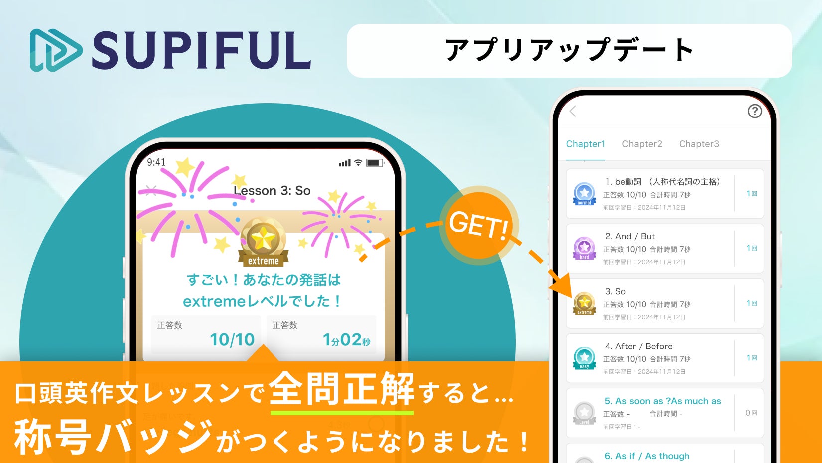 口頭英作文のレッスンを全問正解すると、完了時間に応じてeasy/normal/hard/extremeの4段階で称号バッジが自動付与されるようになりました。努力と成長を可視化する“特別な証”として、達成感が得られると同時に、弱点の把握や復習の優先づけがしやすくなります。