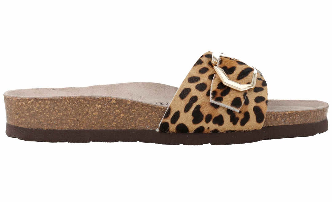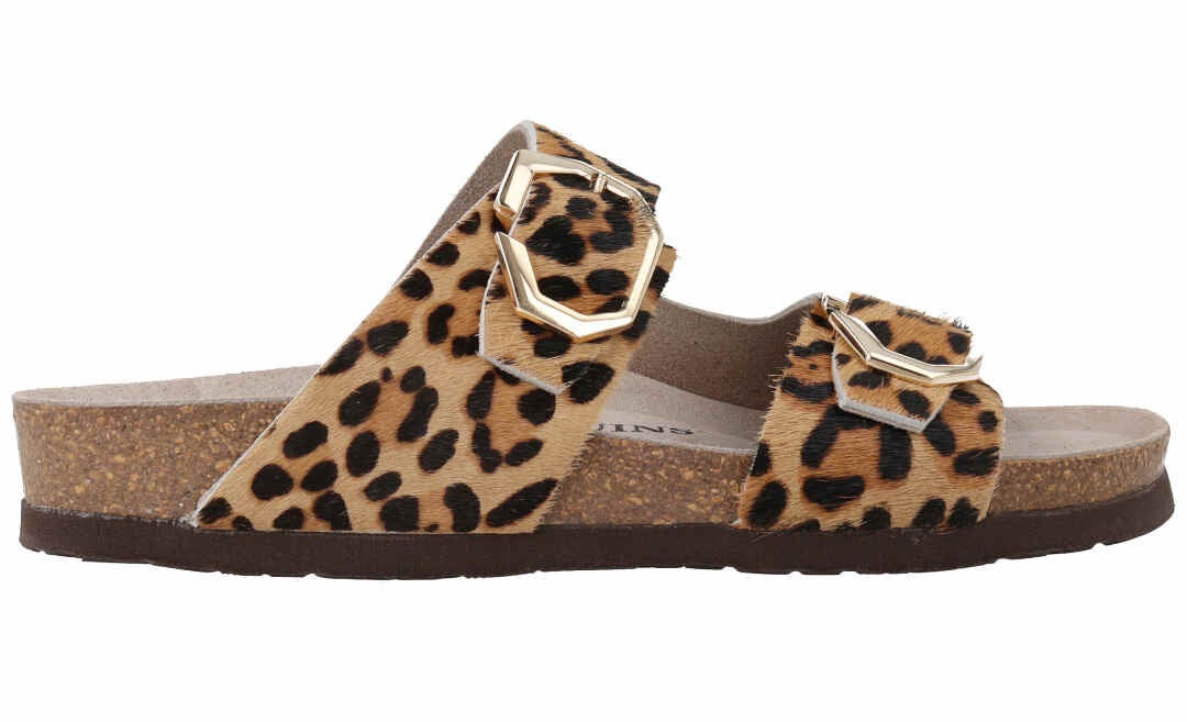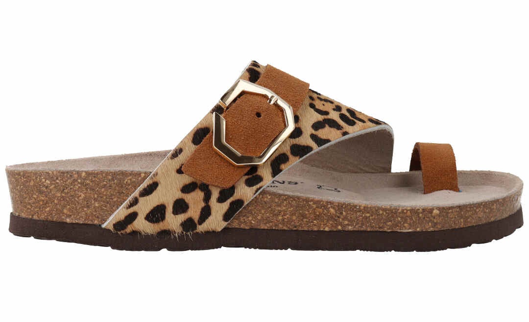 LWG(※)ゴールド認定のレザーにレオパード柄をプリントしたトングデザインの新モデル。人体構造に基づいて設計された天然コルクのミッドソールとフォームのフットベッドが足をサポートし、足への圧力を分散。安定性を向上させ、快適な歩行を実現。バックルで調整可能、アウトソールには軽量EVAを採用。