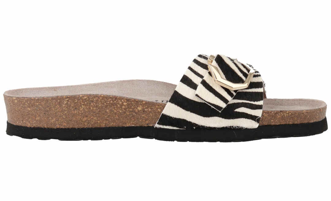 LWG(※)ゴールド認定のレザーにアニマルプリントを施したワンストラップタイプの新モデル。人体構造に基づいて設計された天然コルクのミッドソールとフォームのフットベッドが足をサポートし、足への圧力を分散。安定性を向上させ、快適な歩行を実現。バックルは調整でき、アウトソールには軽量EVAを採用。