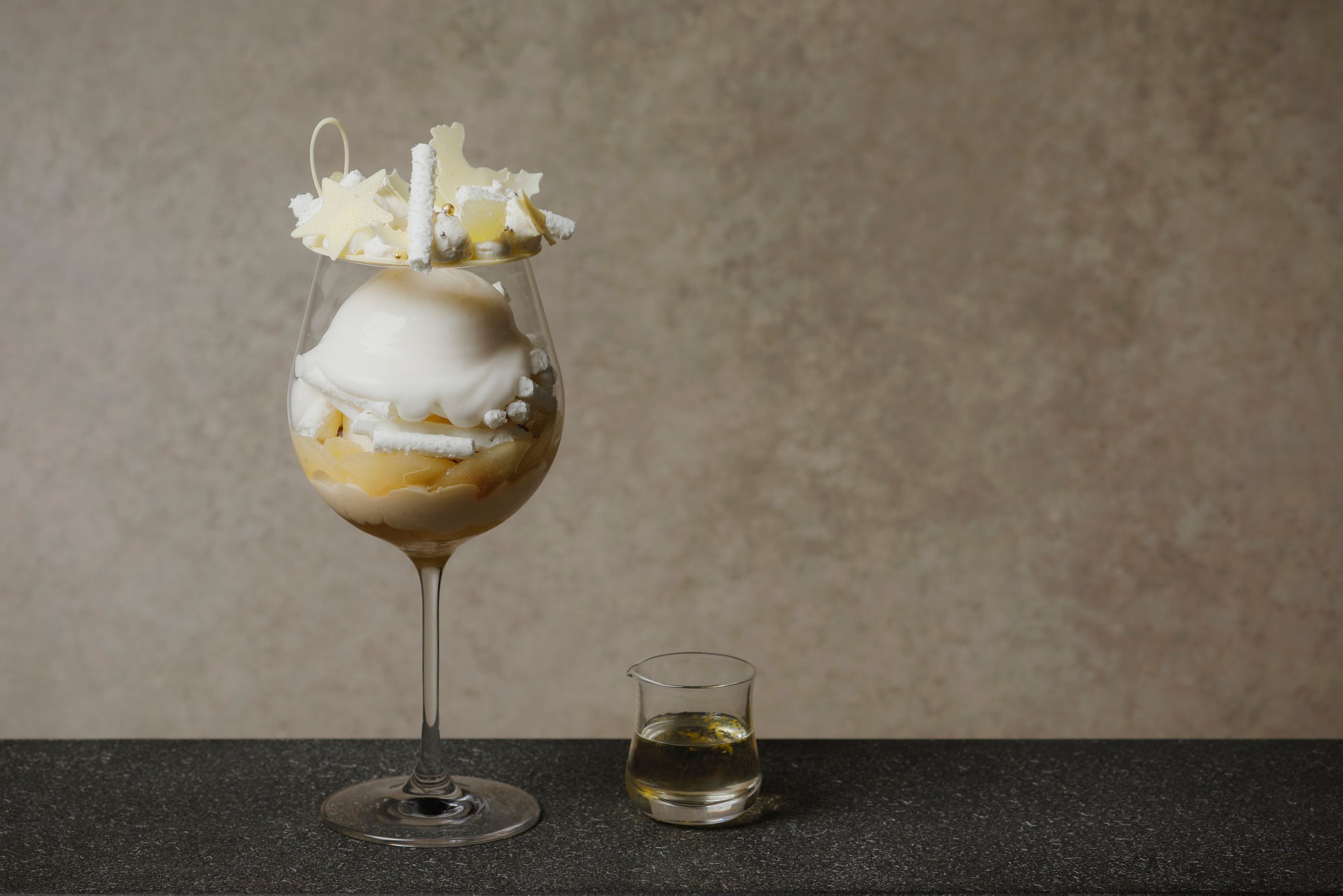 グラスの上には、トナカイや星などクリスマスならではのモチーフを、ホワイトチョコレートで散りばめました。そのまま、または、崩してパフェの中に入れ、濃厚な甘みをアクセントとしてお楽しみください。さらに、お好みで、別に添えたシャンパーニュと柚子のソースをかけることで、味と香りの変化を感じていただけます。