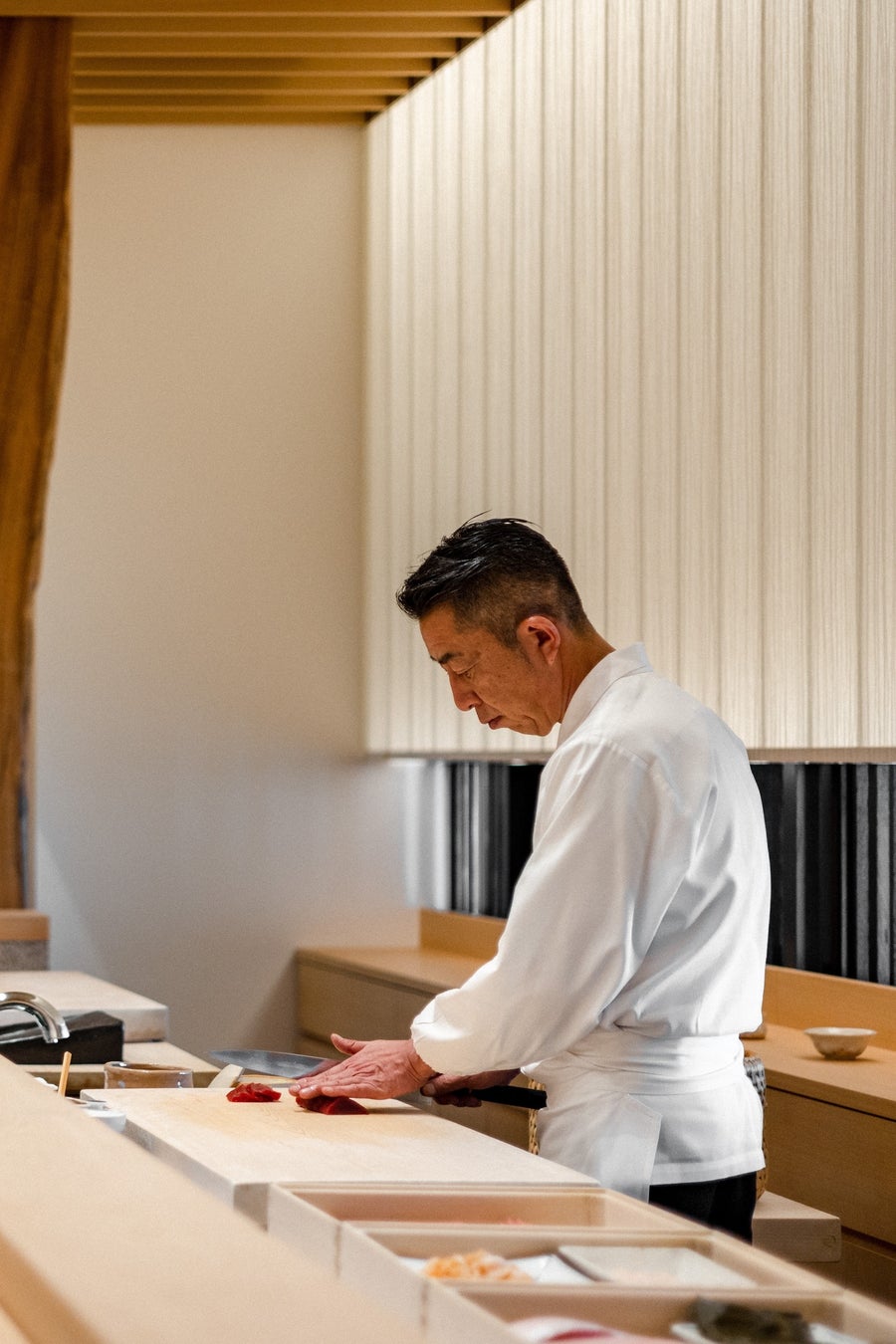 武蔵 by アマンでは、江戸前鮨一筋40年の経験を持つ親方 武蔵弘幸が、「米も酒も器も、自ら作ったものでお客さまをもてなしたい」という想いのもと、唯一無二の鮨体験をご提供しています。シャリには、親方の故郷・山梨で自ら田植えから収穫まで手がけた「ひとめぼれ」を使用。その米を醸して生まれたオリジナル日本酒「武蔵 by アマン エクストラ ドライ」は、清らかな水で育まれた米の旨みが鮨と絶妙に調和します。旬のネタを丁寧に仕込み、心を込めて握るおまかせコースをぜひご堪能ください。厳選したプレミアムな日本酒のペアリングメニューもご用意しております。