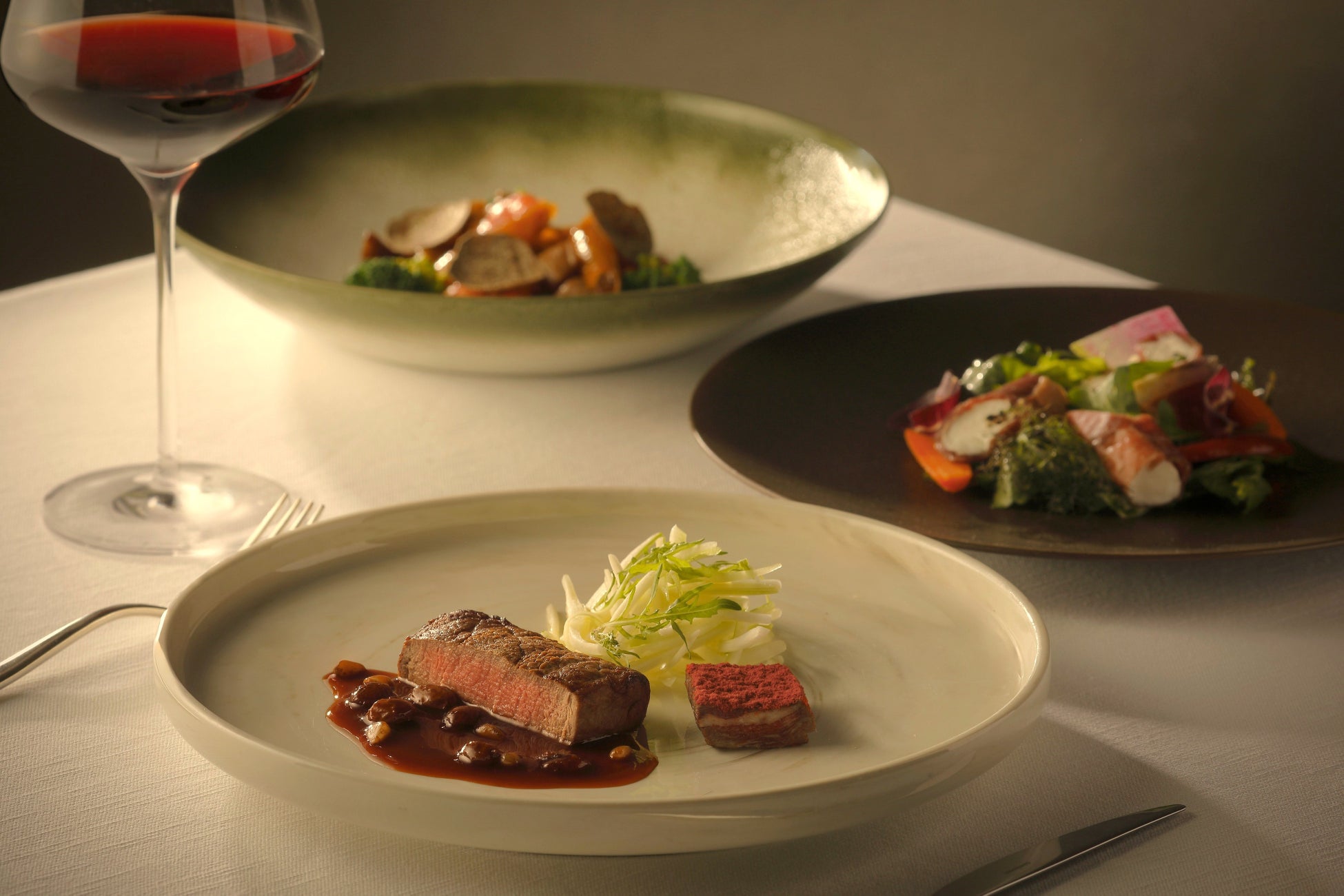 ディナーコースは全7品。静岡県産鰻の炭火焼きにアマローネのソースと柘榴を添えたヴェネト州の一皿から始まり、オマール海老と黒トリュフを合わせた自家製パスタ「ガルガネッリ」や、北海道産みついし牛フィレ肉のロースト、そしてローマの伝統料理「コーダ アッラ ヴァチナーラ」をイメージした濃厚なソースが印象的なメイン料理など、いずれも深みのある味わいが魅力です。イタリアの豊かな食文化と日本の旬の食材が織りなす、旅するようなメニューの数々をぜひご賞味ください。