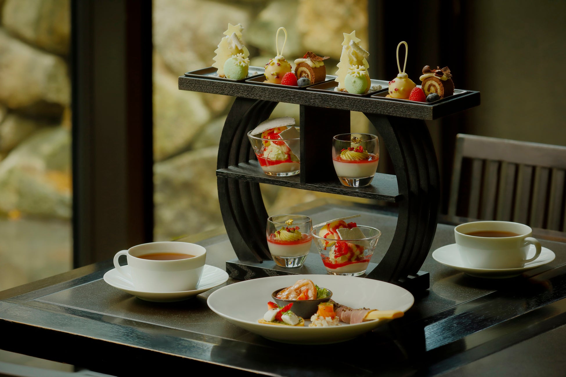 スタンドの上段には、3種類のケーキが並びます。ツリー型のケーキは、花のような香りのトンカ豆のムースに、カシスのコンポートを閉じ込めました。ココナッツメレンゲや小さなサンタのモチーフが、遊び心を添えています。丸太を模したプチケーキ「ブッシュ ド ノエル」は、チョコレートスポンジが柚子ジャムとキャラメルクリームを包み込んで、しっとりとした食感に仕上げています。また、ライチのムースにはレモンのコンフィを忍ばせ、ホワイトチョコレート、ドライラズベリー、ピスタチオをあしらって、クリスマスオーナメントの煌めきを演出しています。