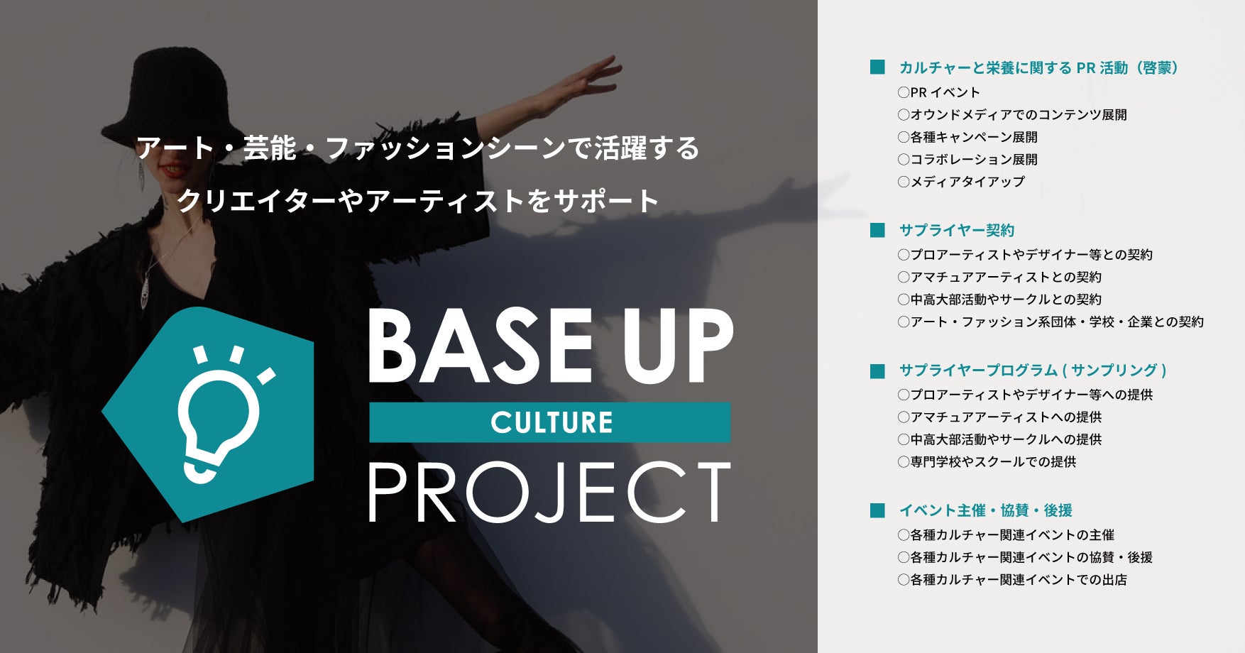 アート・芸能・ファッションなど、クリエイティブな活動の“ベースアップ”をサポートする取り組みとして、アーティストやデザイナー個人・団体に向けた「BASE FOOD」商品の提供等、各種サポート活動を実施いたします。