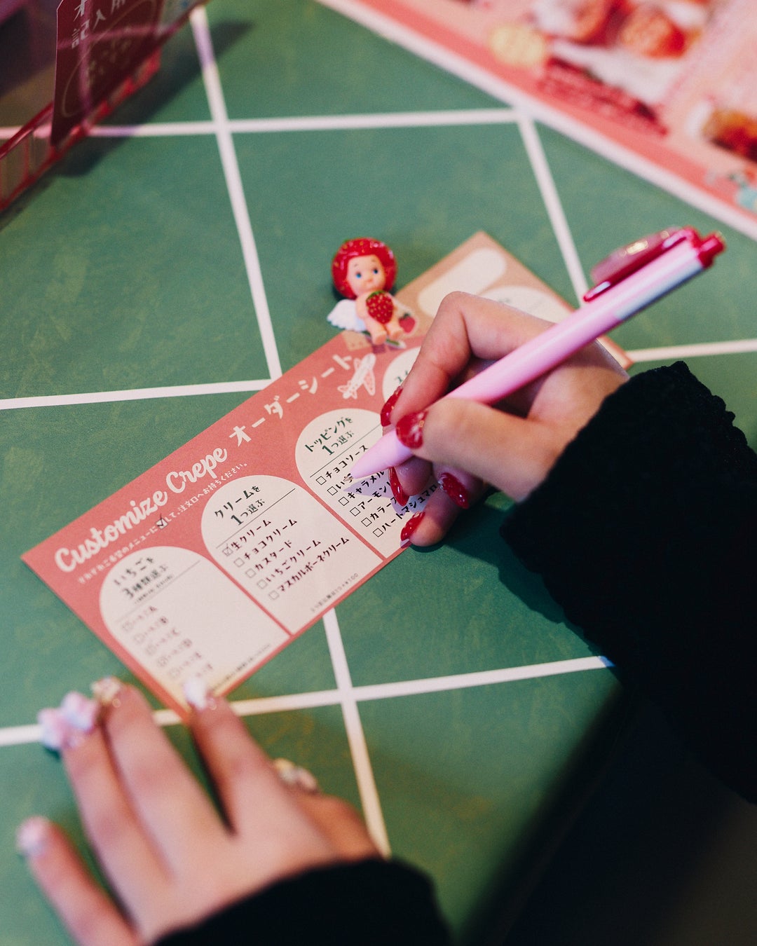 自分好みにカスタマイズした特別なクレープを食べることができる体験型ブース「旅するいちごのクレープリー」が今年初登場しています。本イベントオリジナルのキュートなオーダーシートに注文を手書きでチェックしていただくことで、まるでメニューを作っているような気分もお楽しみいただけます。メインとなるいちごを、日替わりで厳選した4種類以上の産地・品種から選び、トッピングとしてクリーム・ソース・アイス・ケーキ等を選べば、自分好みのクレープが完成!
