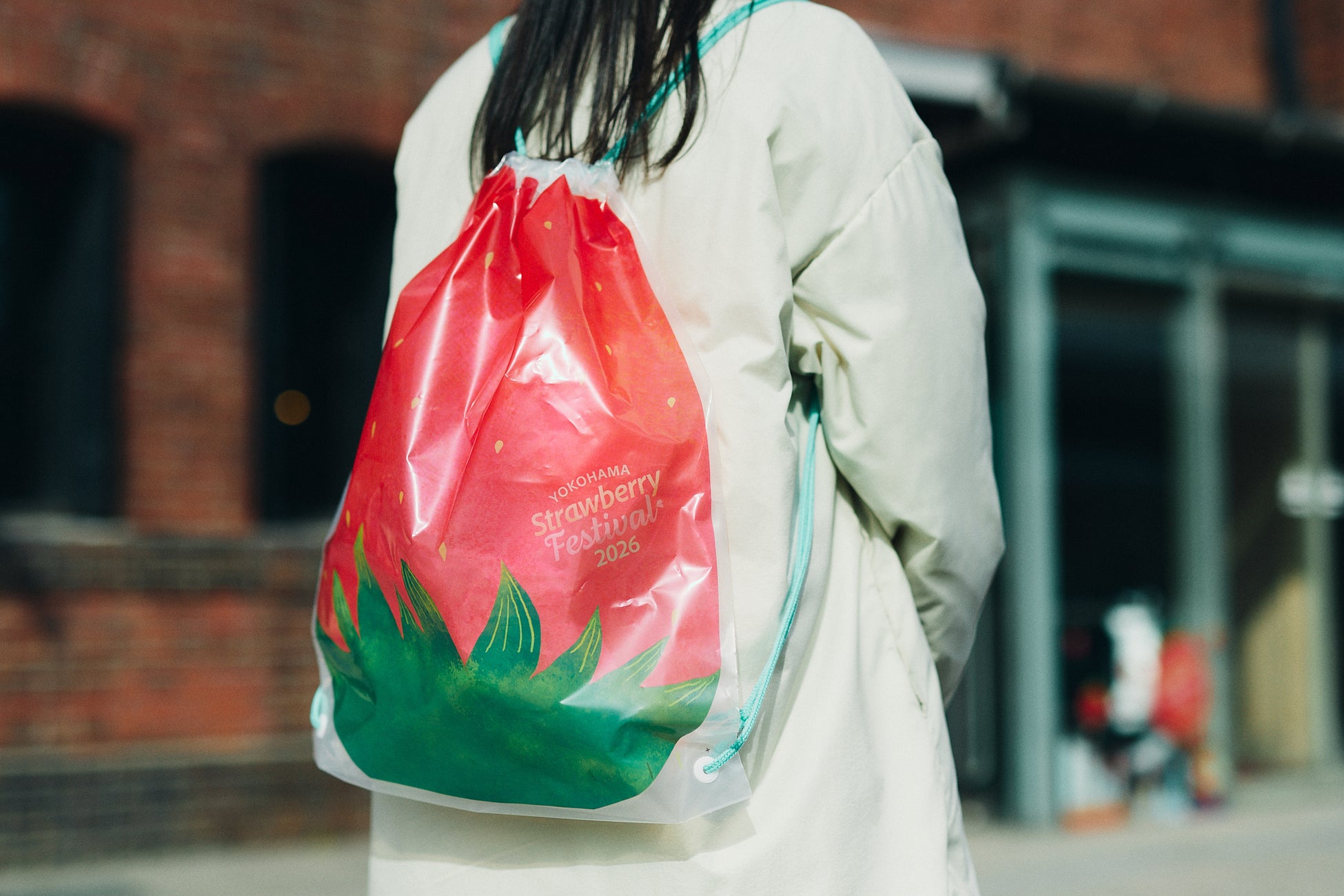 イベント期間中、横浜赤レンガ倉庫1・2号館内の対象店舗で1会計につき2,000円以上(税込)お買い上げのお客様に、イベントキービジュアルのデザインをあしらった「いちごナップサック」をお会計時にプレゼント!横浜赤レンガ倉庫を訪れた記念として、いちごを身に着けて会場内や街歩きを楽しめるアイテムです。