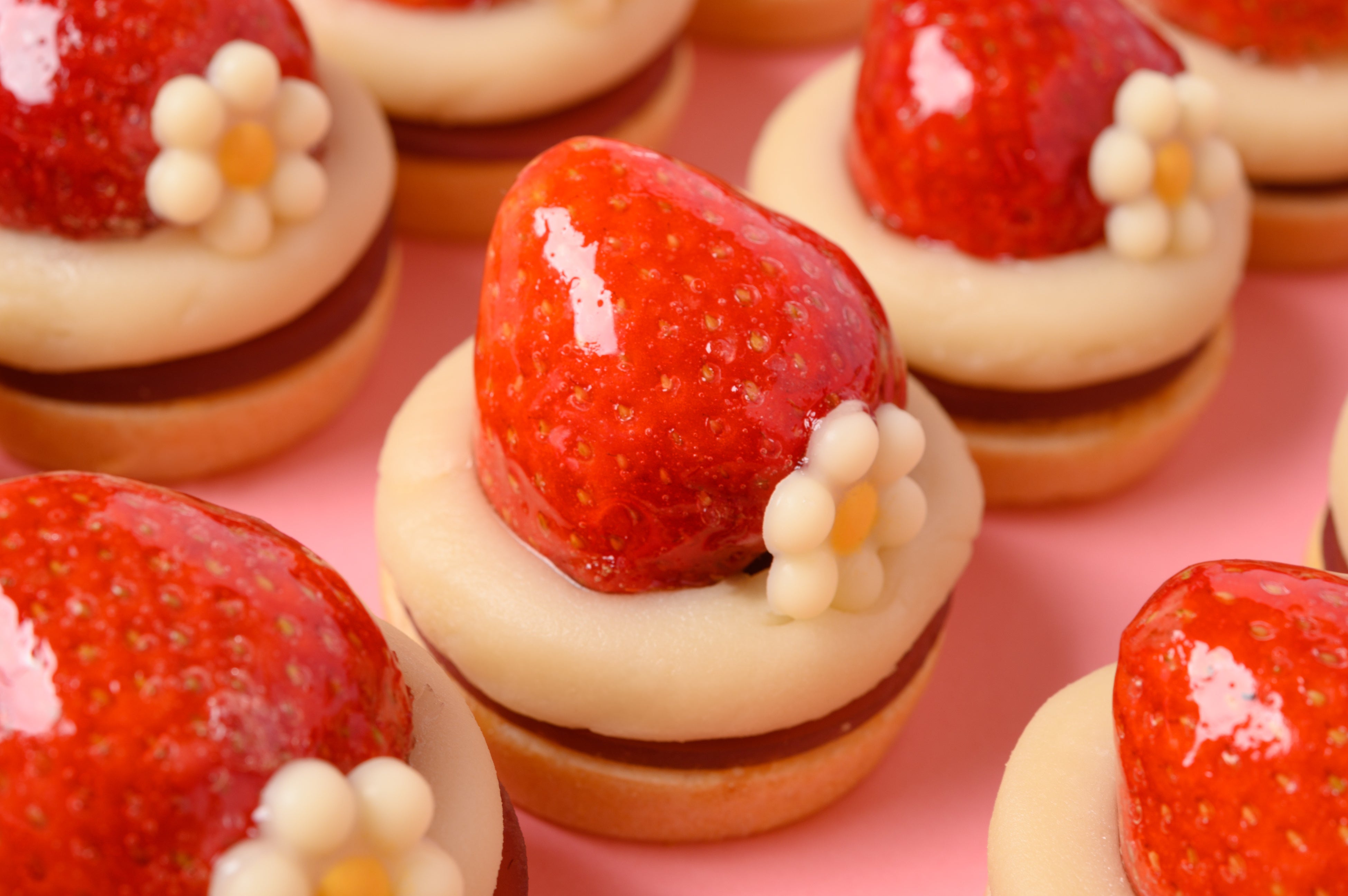 練乳ホワイトチョコ餡と国産粳米最中種、香ばしく豊かなサブレが調和。あまおう苺をトッピングしました。