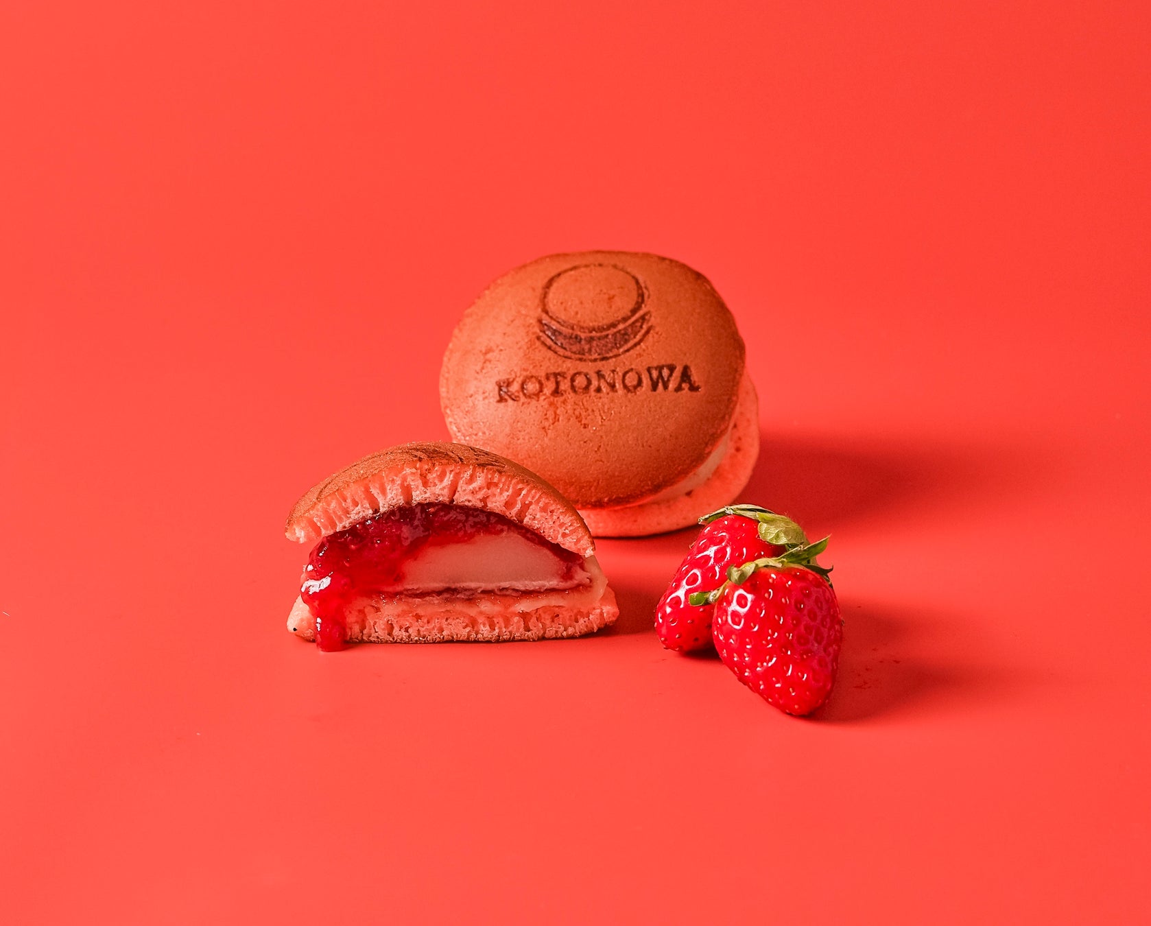 奈良県の名産古都華いちごを使用したジャムどら。丁寧に焼き上げた生地に古都華いちごのジャム、ミルクベースの白あん、求肥を挟んだ奈良県ならではのどら焼き。