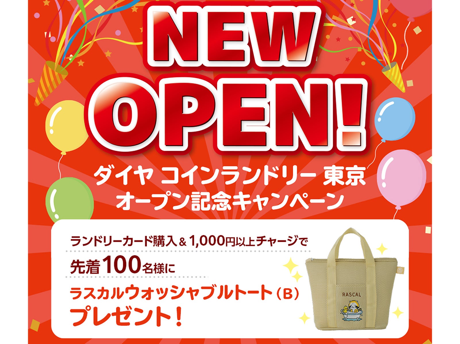 ダイヤ株式会社(本社:東京都中野区、代表取締役:豊澤一誠)は、2024年11月23日(祝)にグランドオープンした『ダイヤ コインランドリー 東京』において、コインランドリーを利用してくれた方先着100名にダイヤの洗濯アンバサダー「ラスカル」の洗濯グッズをプレゼントするキャンペーンを2024年1