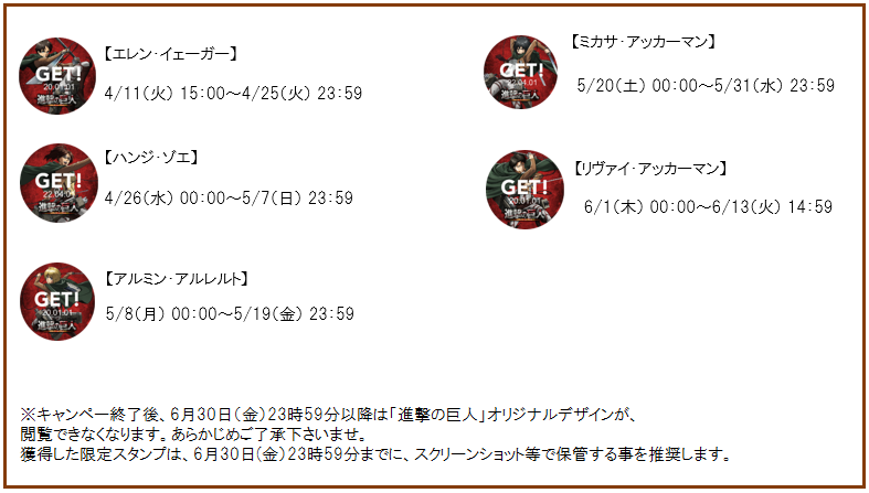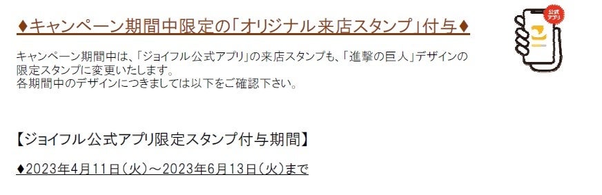 キャンペーン期間中は、「ジョイフル公式アプリ」の来店スタンプも、「進撃の巨人」デザインの