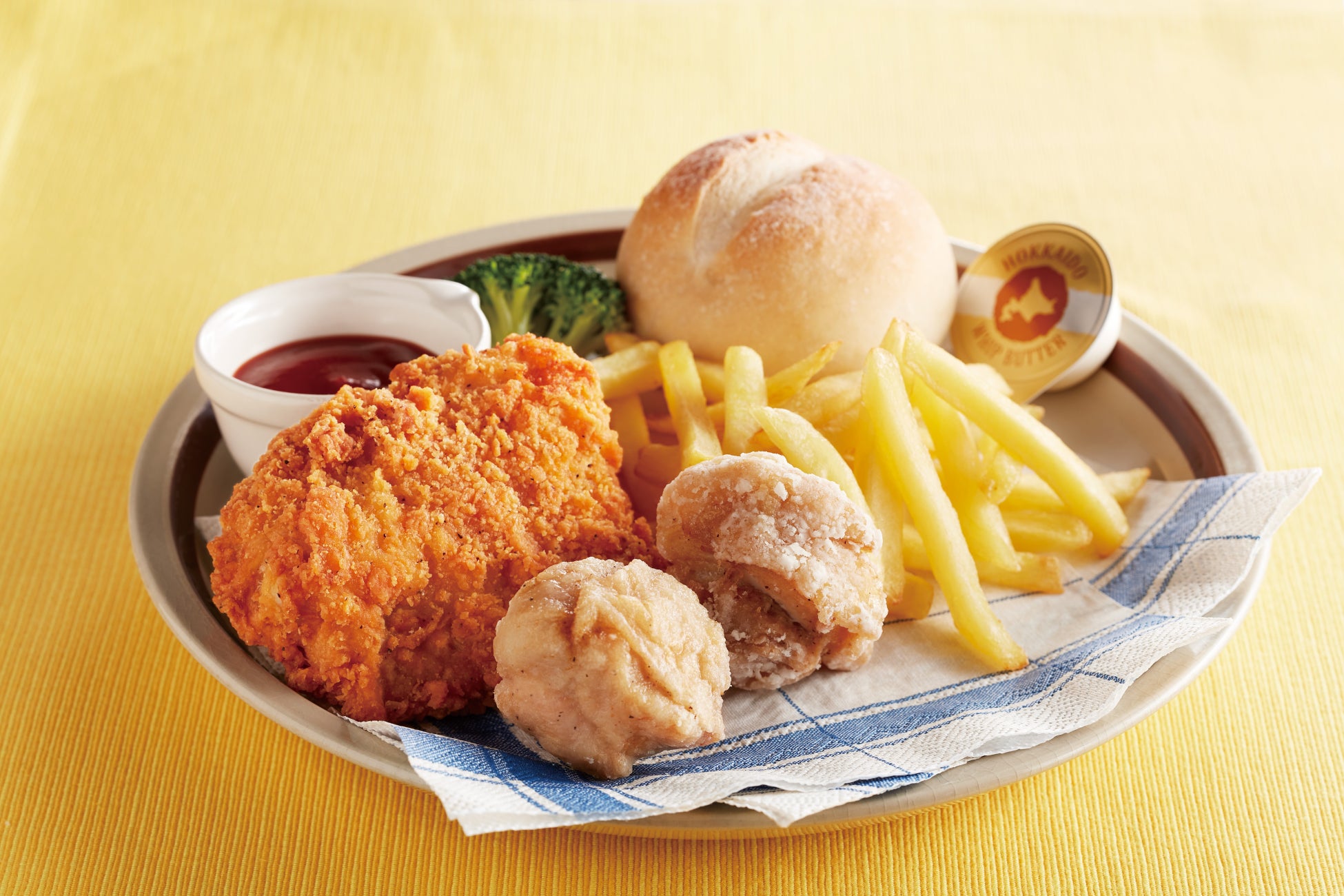 カリッと香ばしいフライドチキン・唐揚げ・ポテトフライ・パンが盛り付けられた贅沢な一品です。