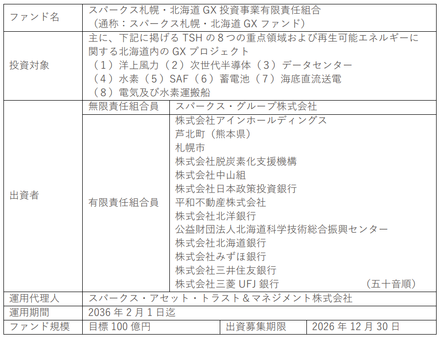 本ファンドは、北海道におけるグリーントランスフォーメーション(GX)関連プロジェクトへの投資を目的に設立された、国内初の地域特化型官民連携GXファンドです。北海道内の再生可能エネルギーに加え、洋上風力、次世代半導体、データセンター、水素、SAF、蓄電池、海底直流送電、電気及び水素運搬船などに投資検討を行う予定です。