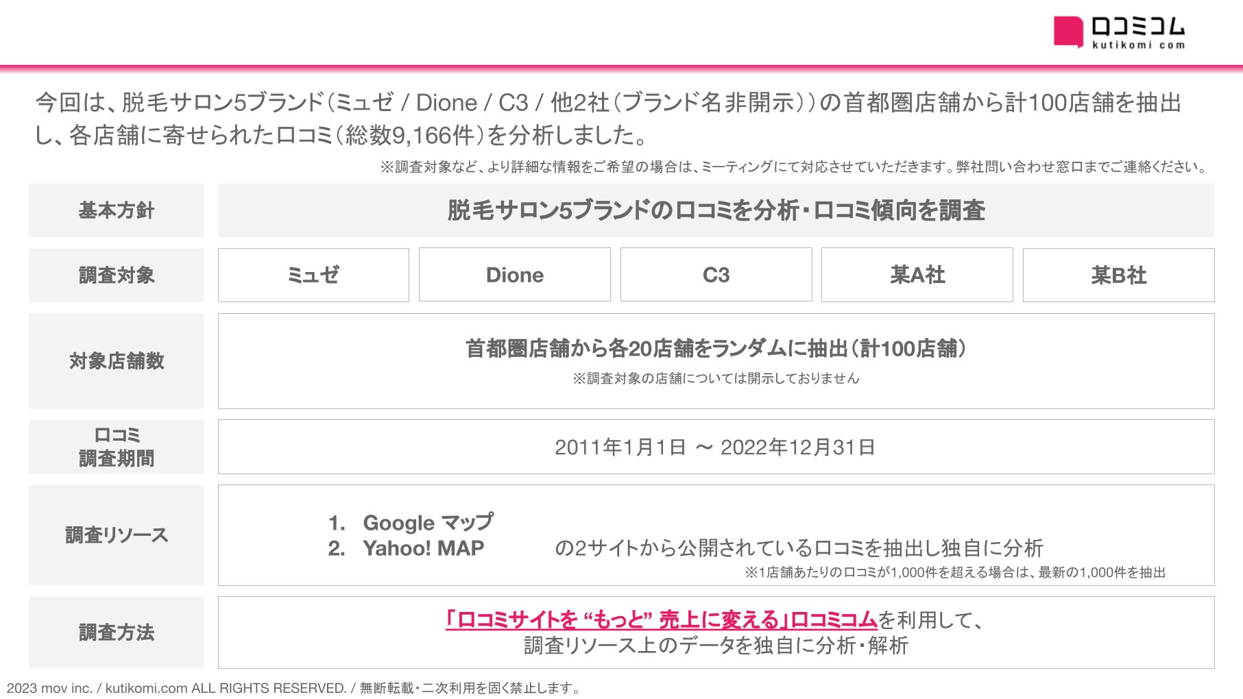 今回は、脱毛サロン5ブランド(ミュゼ / Dione / C3 他)に寄せられた約9,000件の口コミを調査しました。
