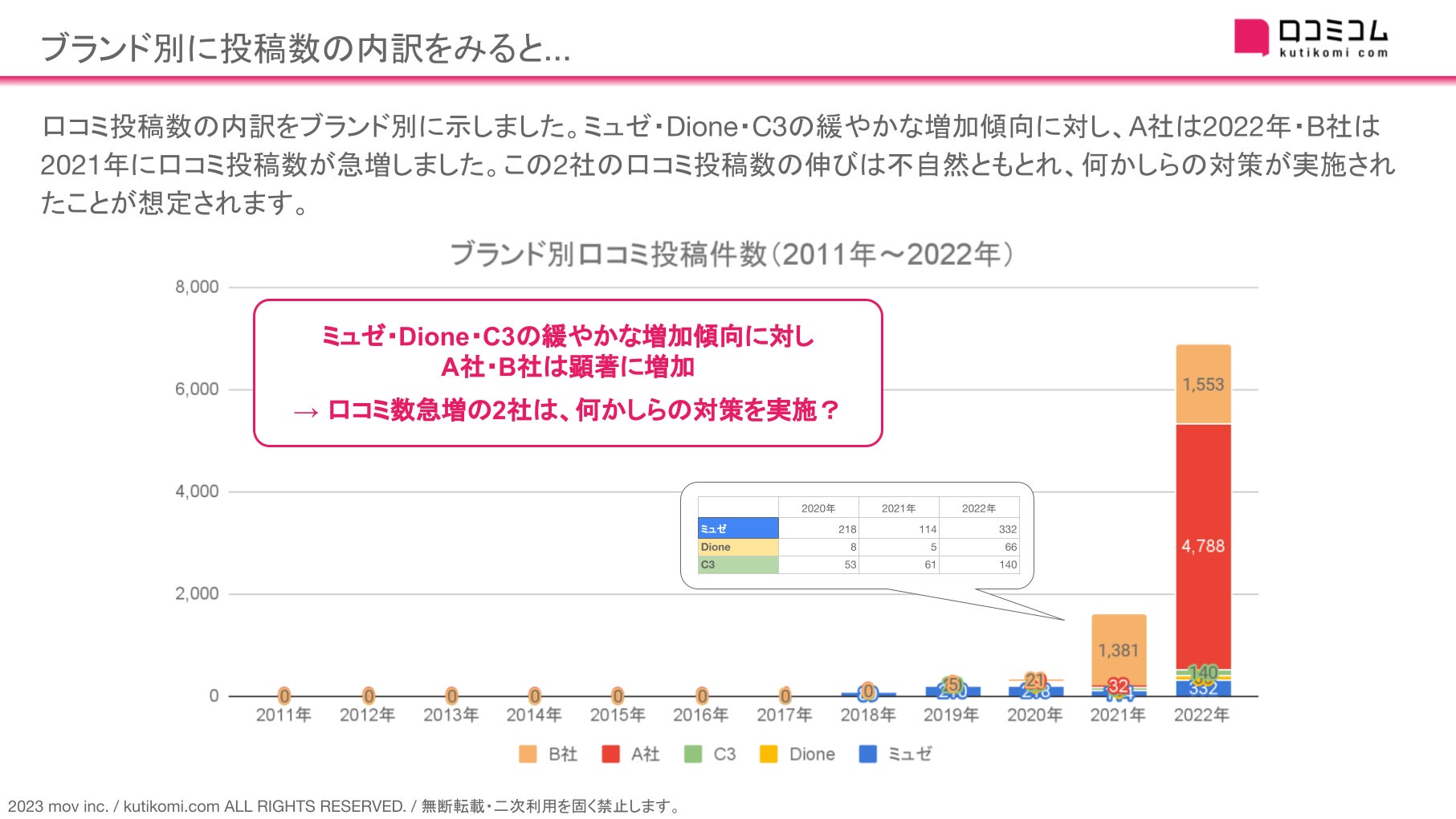 内訳をブランド別に示すと、ミュゼ・Dione・C3の緩やかな増加傾向に対し、A社は2022年・B社は2021年に口コミ投稿数が急増しました。この2社の口コミ投稿数の伸びは不自然ともとれ、何かしらの対策がなされたことが想定されます。