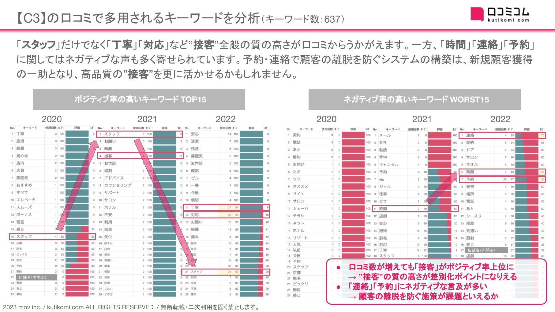 ・【C3】は”接客”への評価が高く、「時間」「予約」の改善が課題となりえること