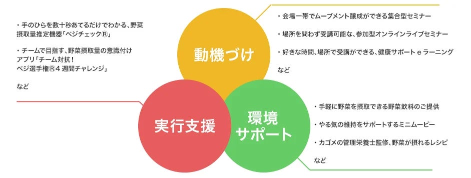 カゴメ「健康サポートプログラム」では、野菜350g/日摂取を支援する「動機づけ」「実行支援」「環境サポート」のPDCAを通じ、健康への行動変容を促します。