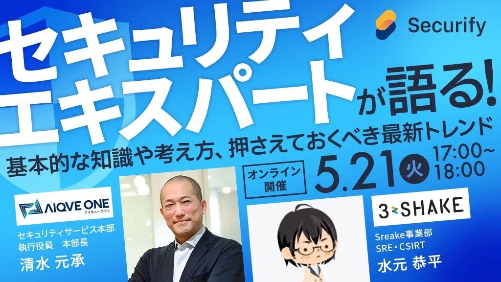 株式会社スリーシェイク(本社:東京都新宿区、代表取締役社長:吉田 拓真、以下スリーシェイク)は、AIQVE ONE株式会社(本社:東京都千代田区、代表取締役社長:山崎太郎、以下AIQVE ONE)と共同で、サイバーセキュリティの基本から最新トレンドと対策を解説する無料オンラインセミナーを、2024年5月21日(火)に開催いたします。