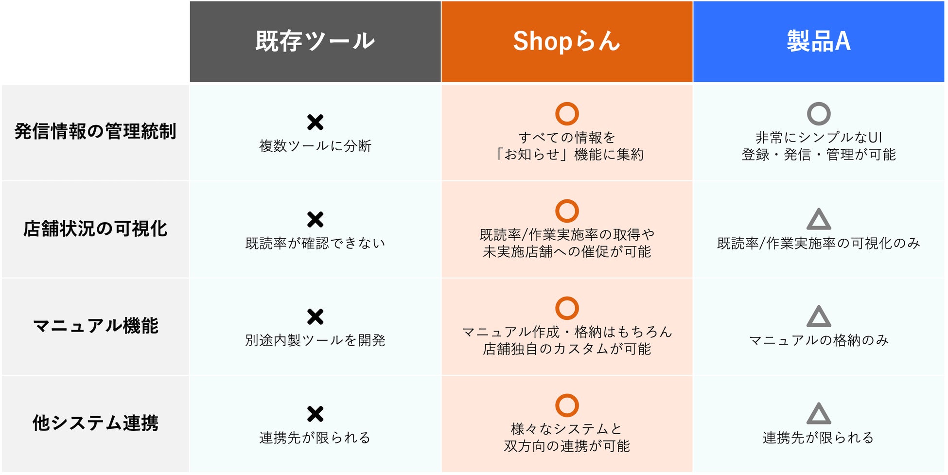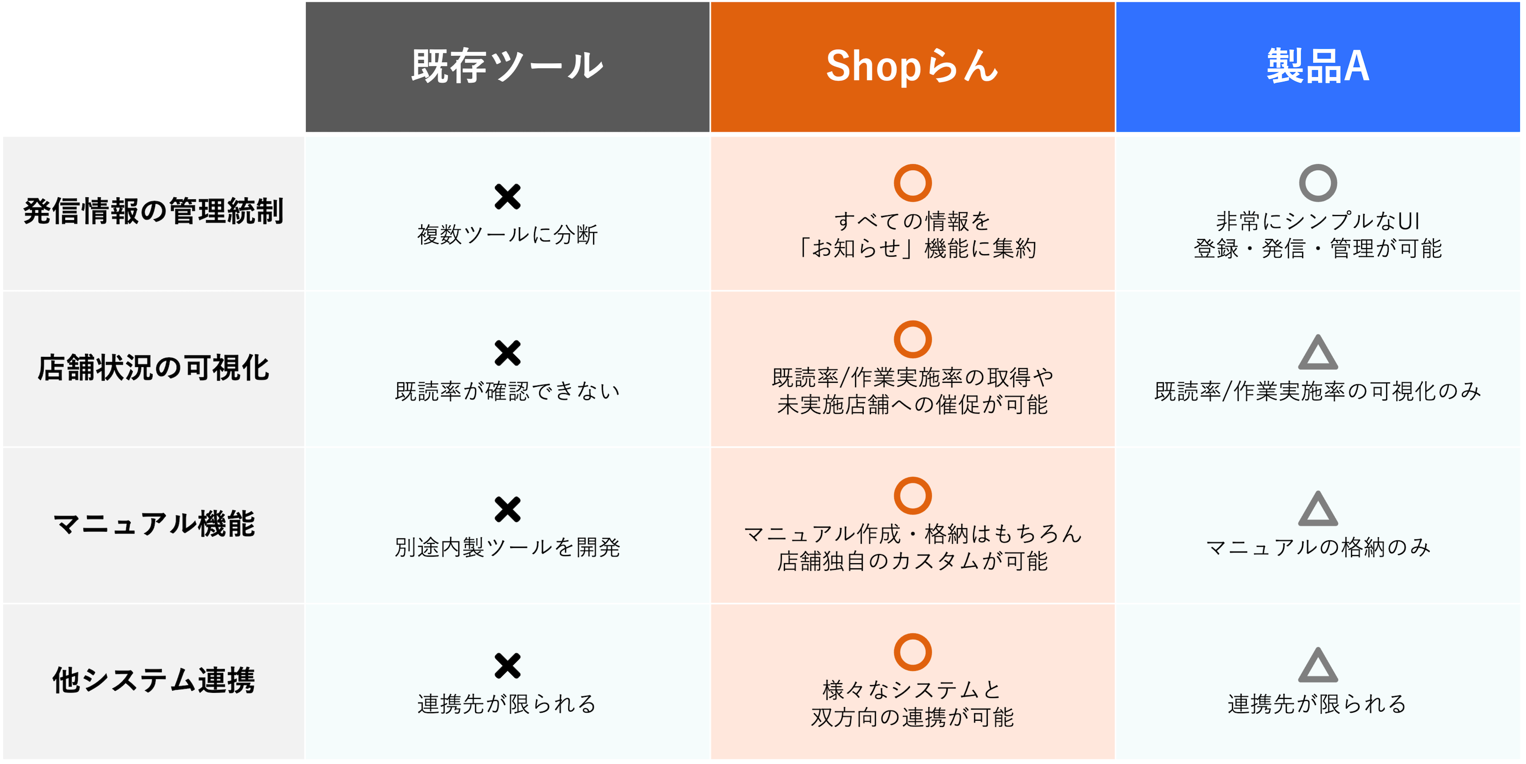 ツール刷新プロジェクトではユーザーアンケートなどを実施し、現場の声も聞きながらツールの比較・検討を推進。 最終的にShopらん(R)を採用した理由は下記のとおりです。