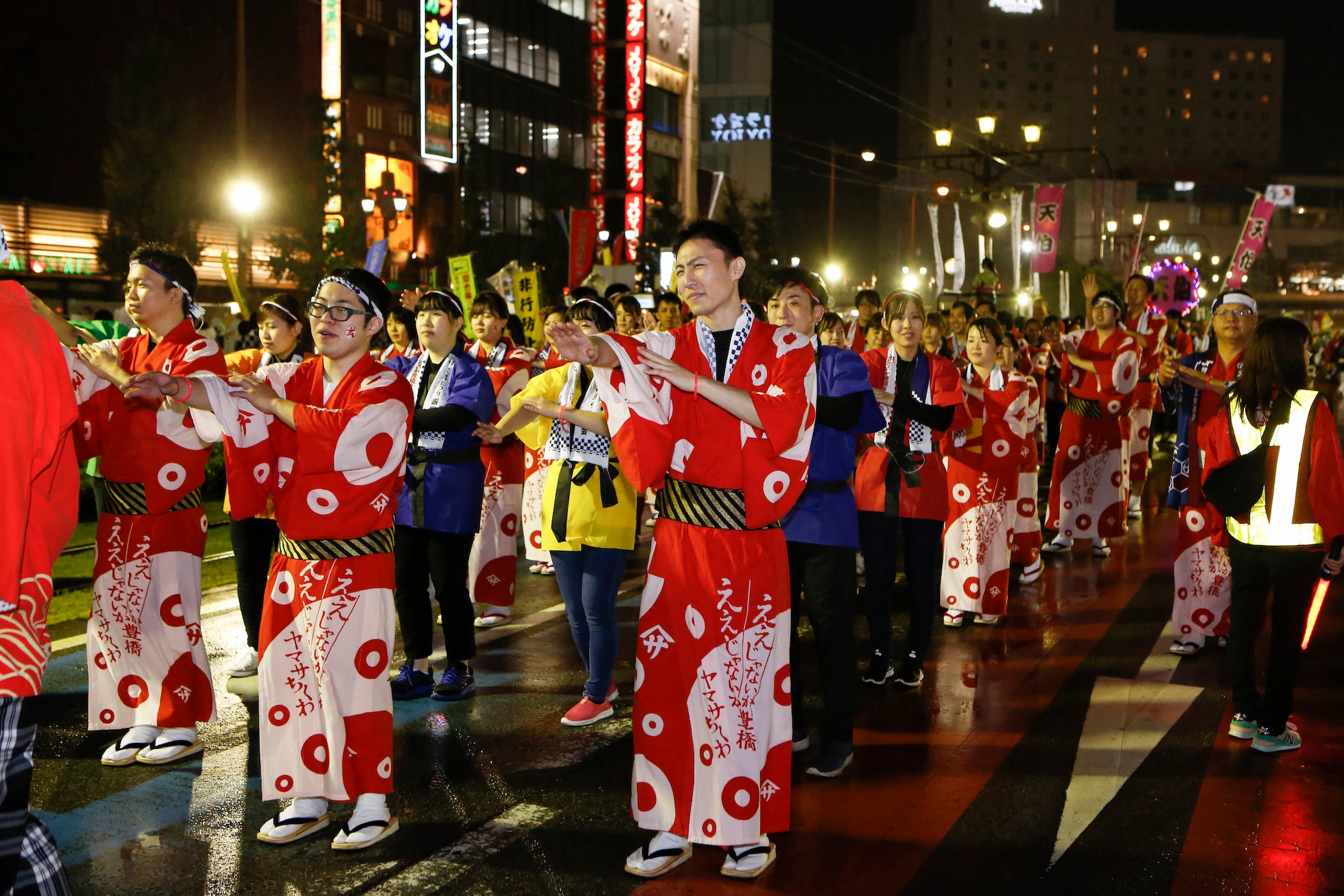 メイン行事「総おどり」は18時30分から、駅前大通りで始まります。