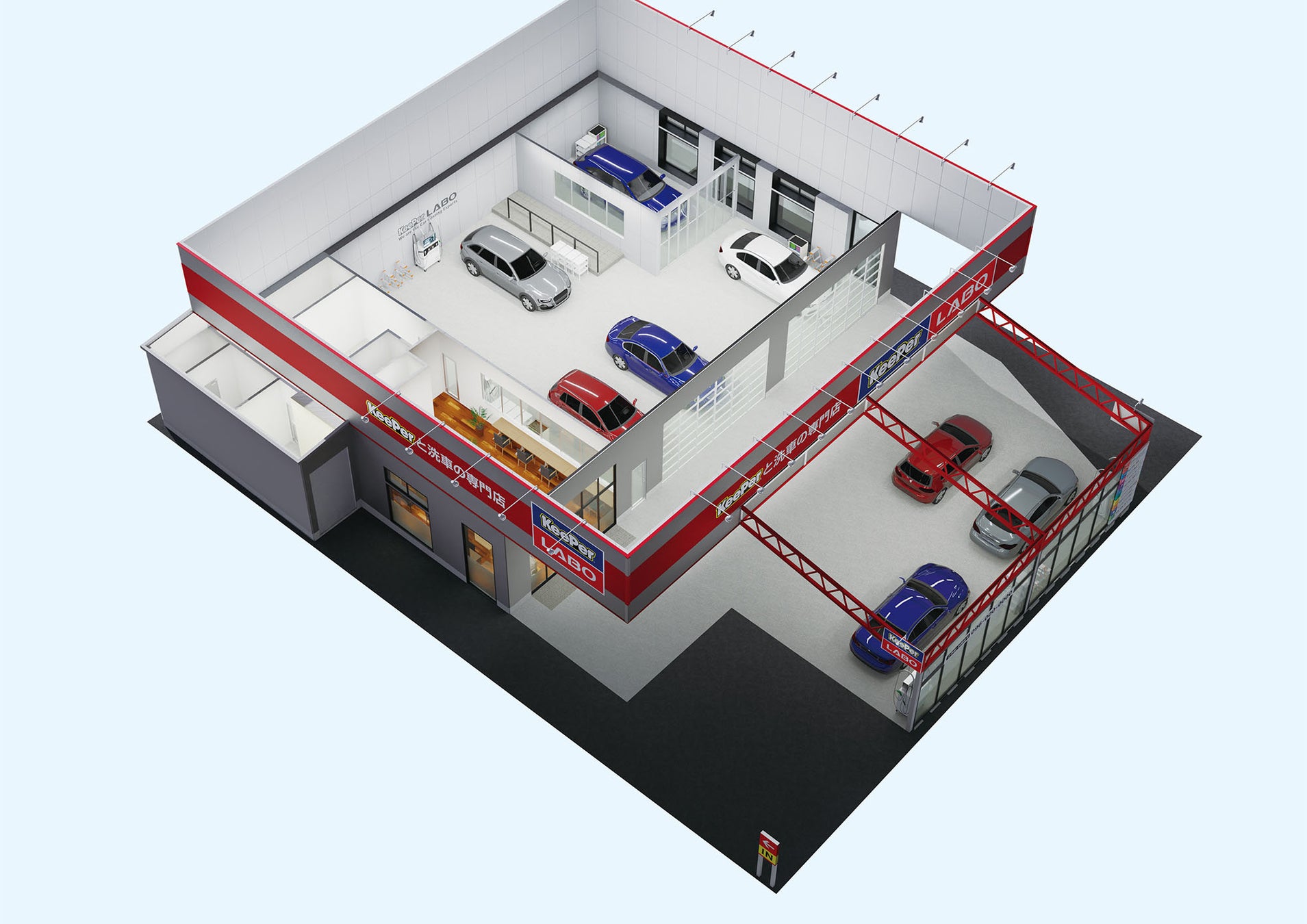 洗車のできるスペースが4台分の大型店舗で、洗車を始めてから最後の仕上げまで、施工を始めたその場で完結できるので、スタッフの車両移動がほとんどない安全かつ労力を軽減した構造で、最新の空調設備・LED照明を配備したお客様・スタッフにとって、最適な環境を整えております。