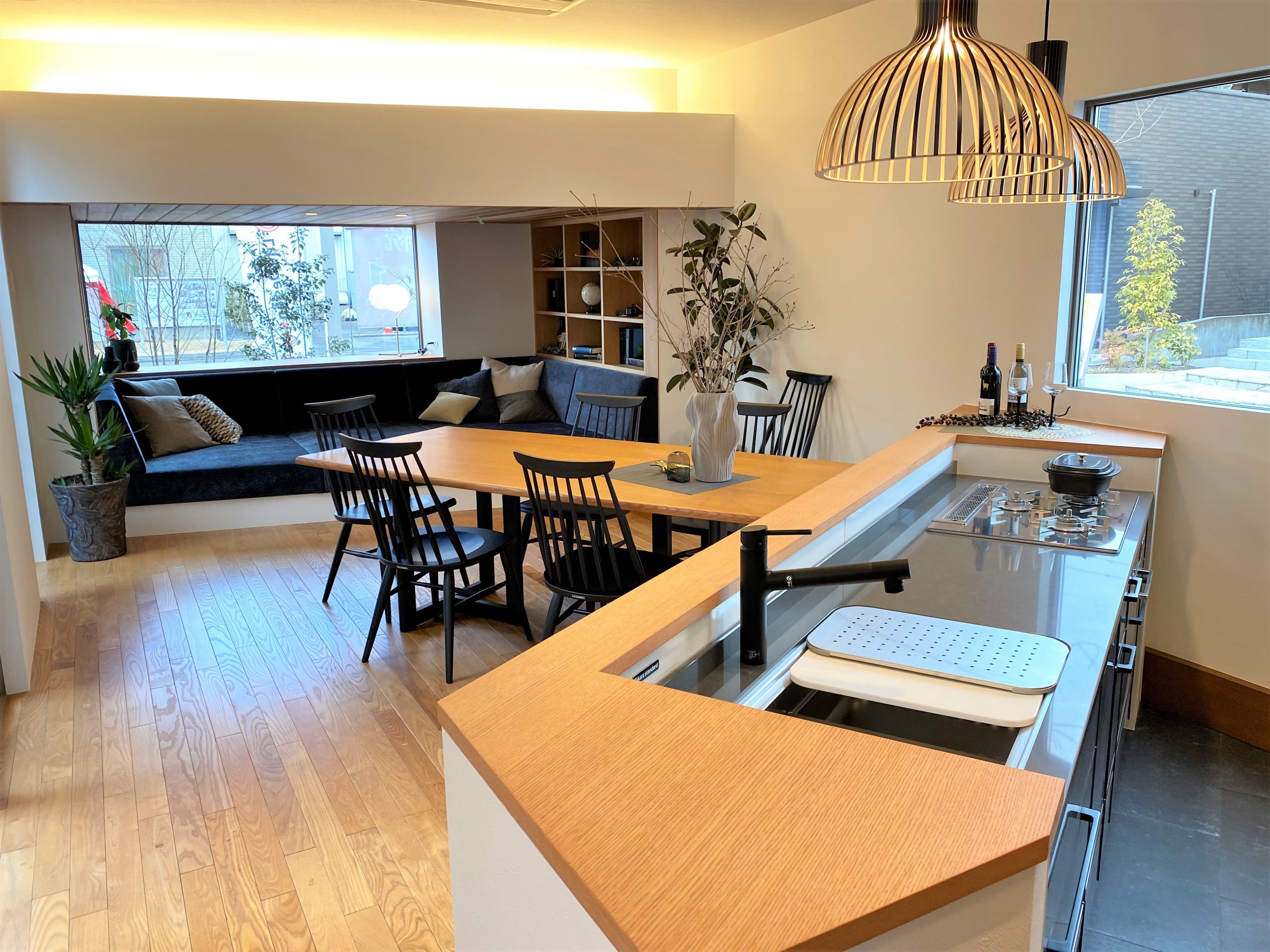 津山イーストランド住宅展示場の中心的な空間となるダイニングは、キッチンを斜めに配置し、本住宅展示場に合わせた作ったソファと本棚を新たに設えることで、印象的で特別感のある空間が完成しました。また、キッチンに立つ人とダイニングテーブルに座る人との目線の高さが合うよう、キッチンは床を一段下げるステップダウンフロアを採用しています。