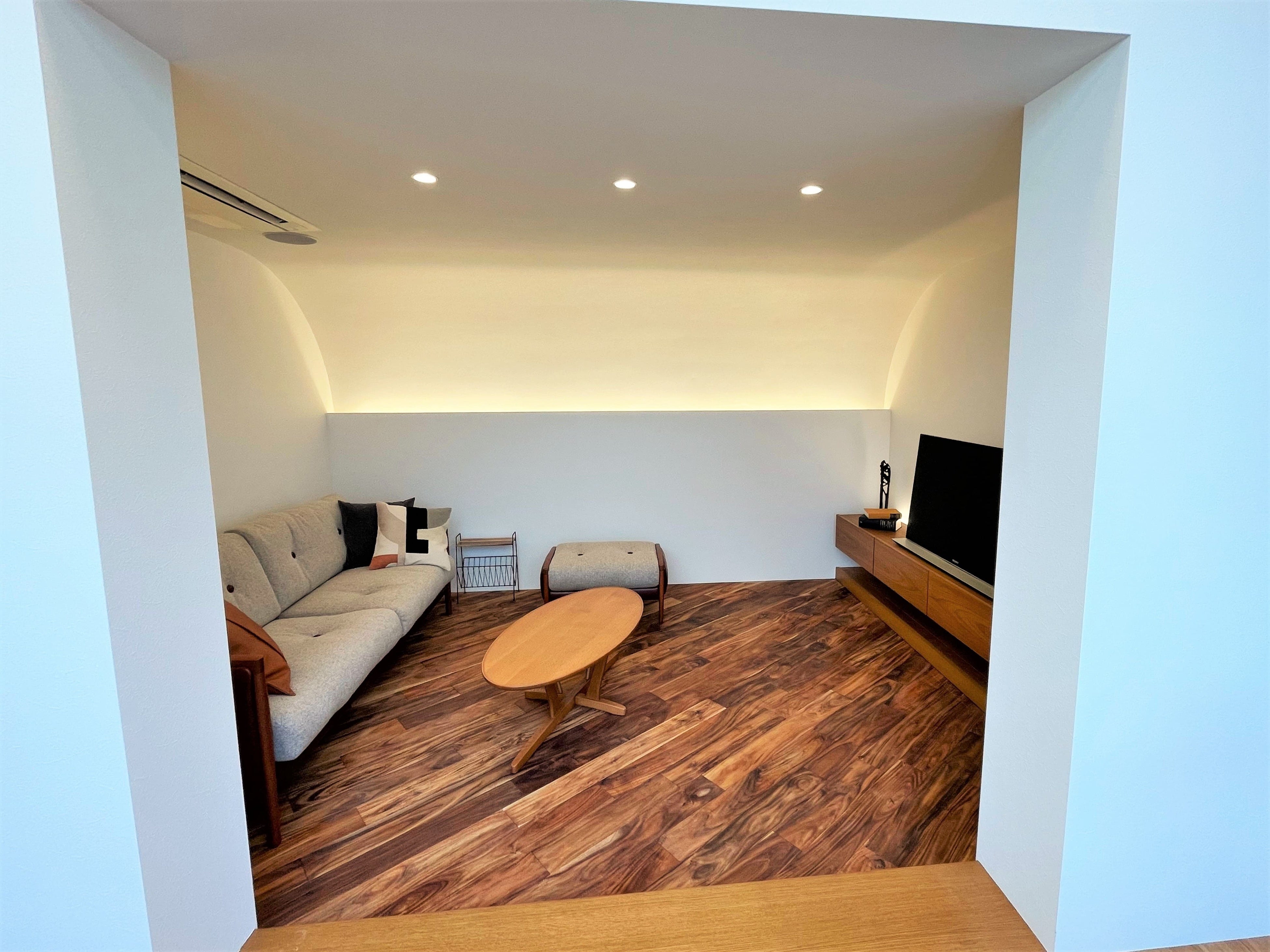 そして、リビングは、ずっといたくなるような心地の良いくつろぎの空間を実現しました。出入口の両サイドにはあえて壁を新設し、リビングにもステップダウンフロアを採用することで、リビング空間を程よく仕切り『おこもり感』を演出。曲線を描いたアール天井が空間を柔らかく包み込みます。