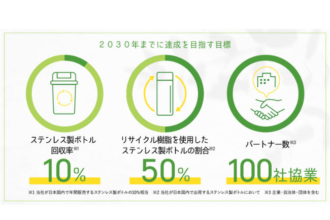 ステンレス製ボトルのメーカーとして「循環型モノづくり」が責務と考え、2021年より、当社製品に限らず他メーカーの使用済みステンレス製ボトルも受け入れて回収し、ステンレスのリサイクル工程の負担を減らし、再資源化するサーキュラーエコノミーの取り組みをスタートしました。2030年までの目標回収率を設定し、初年度では約7,500本のボトルを回収を達成しました。今後も各企業・自治体・団体の皆様と協業の幅を広げ、持続可能な社会の実現に向けて取り組んでまいります。