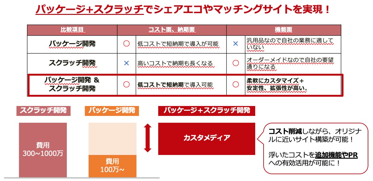 パッケージ機能で基本的なシェアリングやマッチングのシステムを構築できながら、カスタマイズにも対応する当社のシステムは、パッケージ機能オンリーの不便さはなく、フルスクラッチ開発ほど時間や費用がかからない、という特徴を有しており、これまで600サイト以上のお客様に採用いただいております。