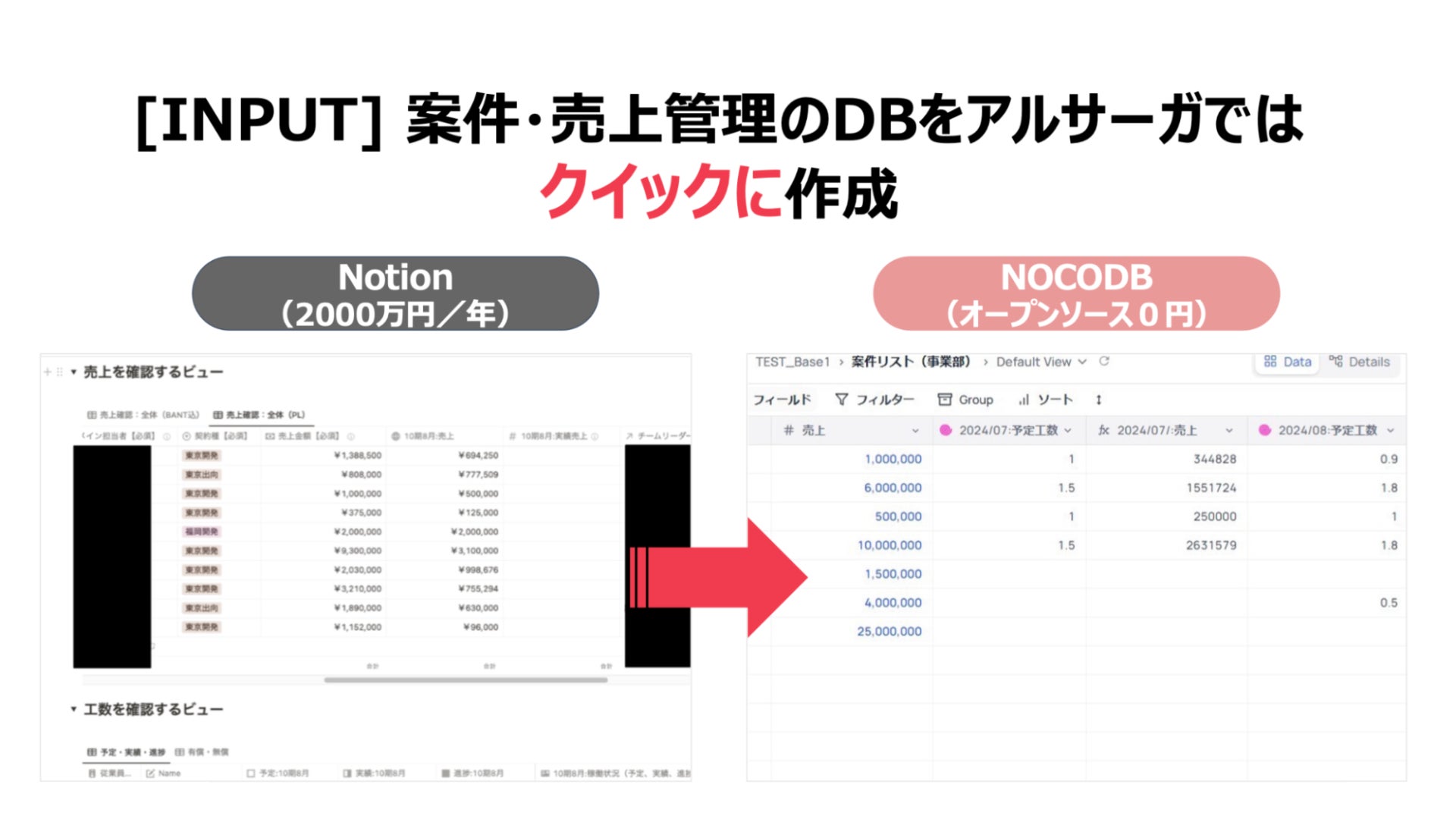 小俣は、スクラッチ開発におけるオープンソースの重要性についても言及しました。当社のプロジェクト管理データベースの内製化事例として、オープンソース(ノコデータベース、メタベース)の活用を紹介しました。これにより、ツール利用料として支払っていた年間2,000万円のコスト削減に成功しました。