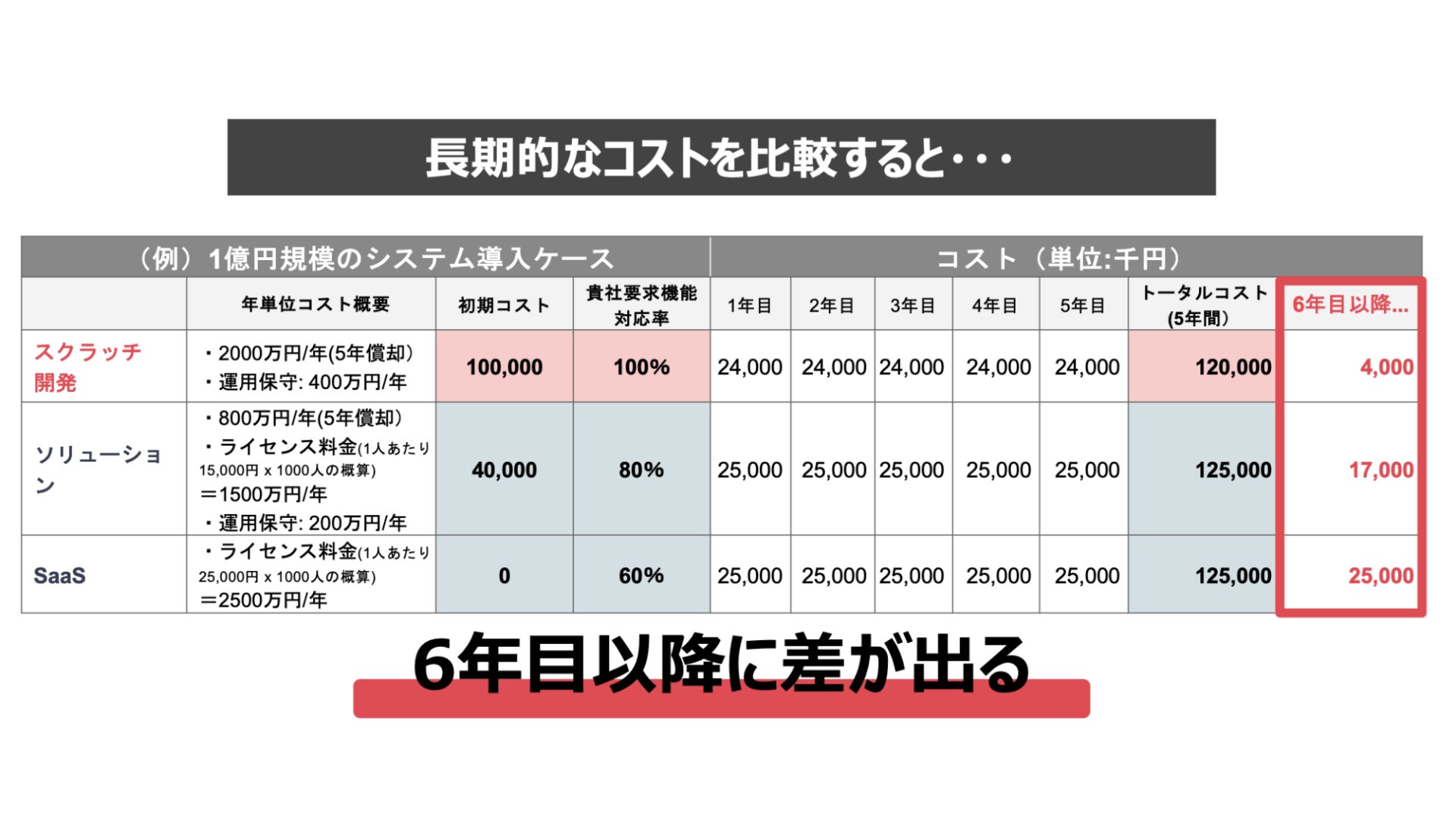 小俣は、必ずしもSaaSサービスの導入が常に最適とは限らず、長期的にはスクラッチ開発の方がコスト的に有利な場合もあると指摘しました。