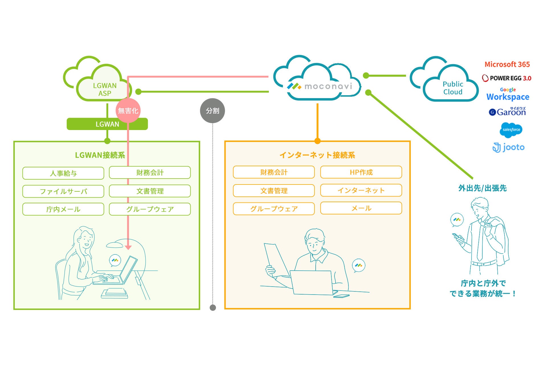 閉域ネットワークであるLGWAN下では、業務効率化やDX化に有効なクラウドサービスの利用はできませんでしたが、『moconavi LGWANクラウドゲートウェイサービス』によって、LGWAN下でも『Re:lation』をご利用いただけるようになりました。