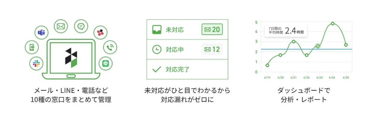 『Re:lation(リレーション)』は、複数の問い合わせ窓口を一元管理し、チームで共有できる顧客対応クラウドです。メール、電話、チャット、LINEなど多様化するコミュニケーションサービスを一つの画面で扱えるため、顧客との接点が増え複雑になった問い合わせを簡単に一元管理できます。