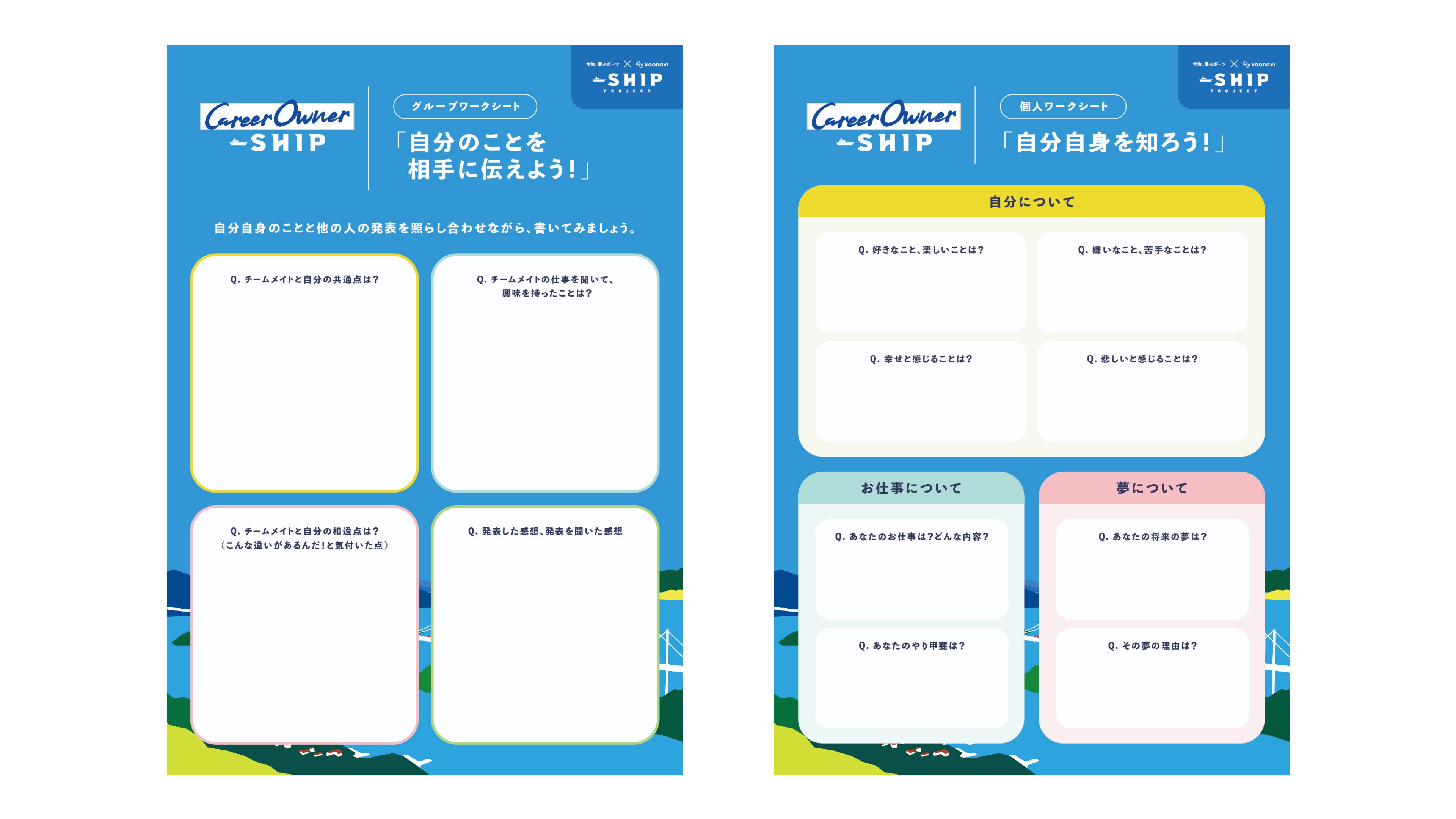 当日は、今治市にある美しい海水浴場「織田ヶ浜」でのビーチクリーニングから始まりました。地元の景観を守るだけでなく、選手と山田さん、カオナビメンバーの交流にも繋がる活動となりました。その後、セミナーでは山田さんご自身のサッカー選手から今に至るまでのキャリアをお話しいただいた上で、選手たちが自分自身と向き合うためのワークショップを開催しました。ワークショップでは、シートを活用しながら自身の好き・嫌い、仕事、夢などを書き出す個人ワークと、書き出した内容をチームで共有するグループワークを行いました。