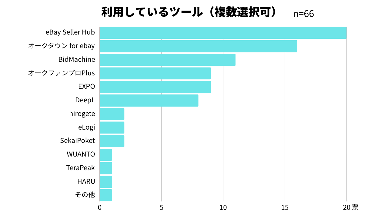 このあとに記載するアンケート結果は前の設問でebayでツールを利用していると回答した66人を対象にしています。ebay輸出を行う際に利用しているツールについて複数選択回答式でアンケートを取りました。