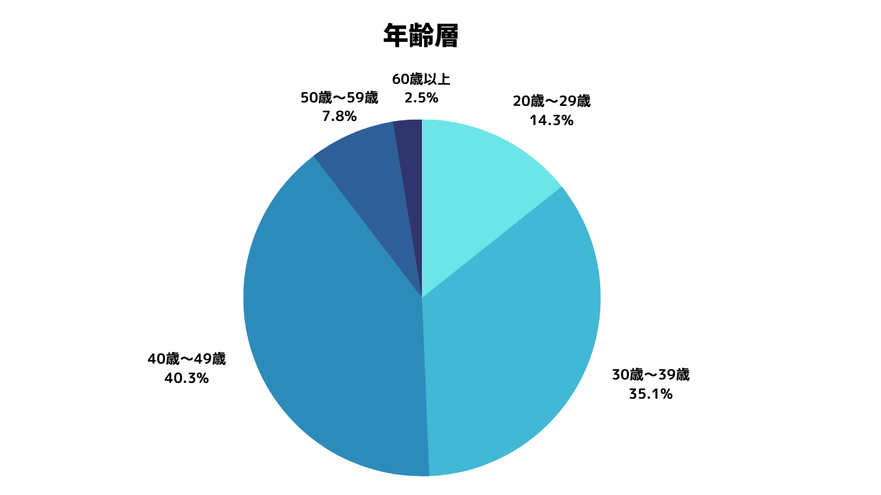 回答者の年齢層は40歳〜49歳が最も多く40.3%、次に30歳〜39歳が多く、35.1%という結果でした。