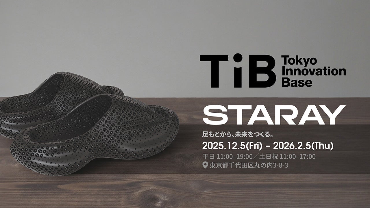 APPLE TREE株式会社(所在地:大阪府大阪市、代表取締役:朴 秀明)は、当社が展開する3Dプリントシューズブランド「STARAY」が、2025年12月5日(金)より東京都のイノベーション拠点「Tokyo Innovation Base(TIB)」内の「TIB SHOP」にて展示・販売を開始したことをお知らせいたします。2026年2月5日(木)までの2か月間、来店者は実際にSTARAYの製品を手に取り、その造形美や履き心地を体験していただけます。
