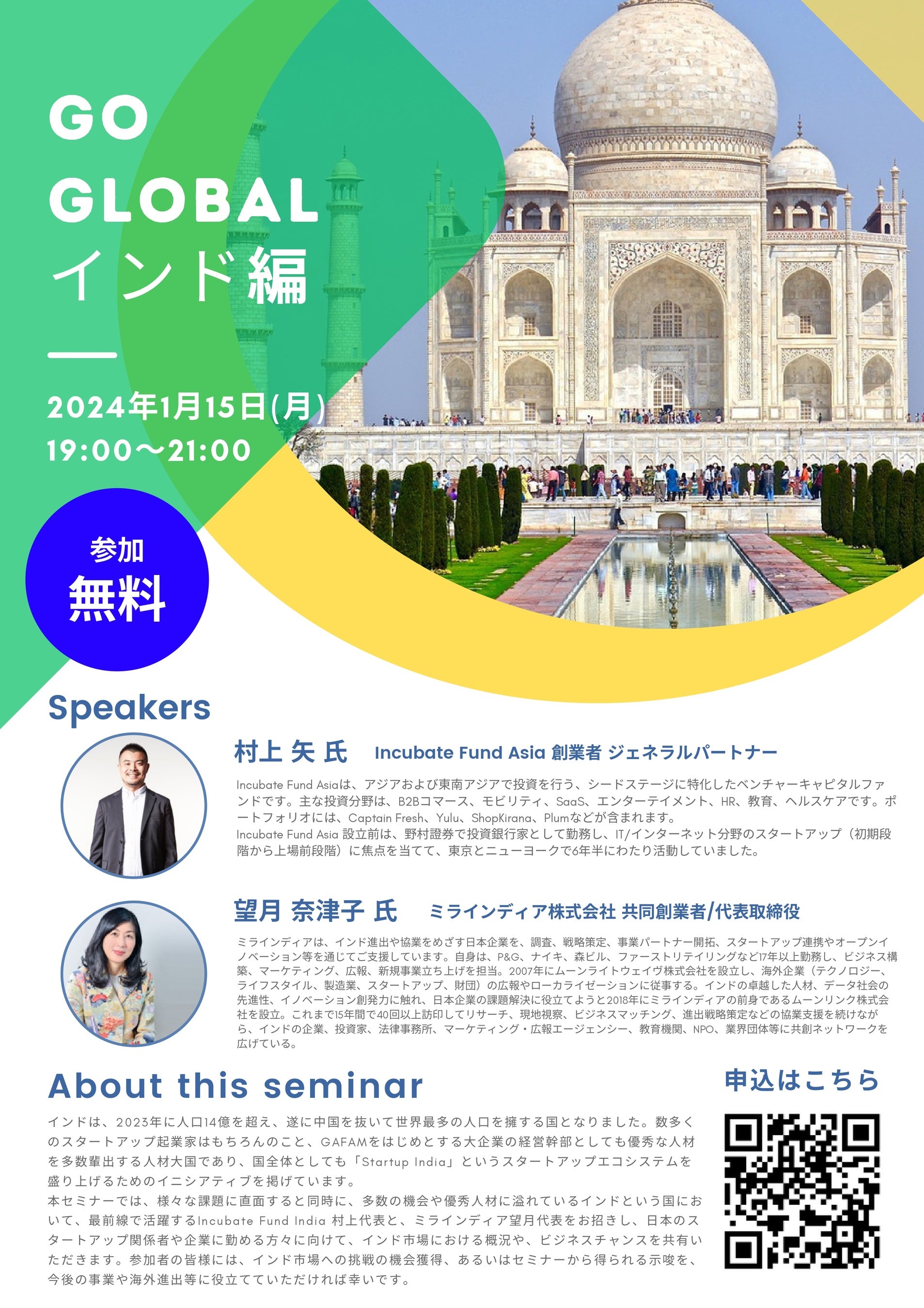 インドは2023年に人口14億人を超え、遂に中国を抜いて世界最多の人口を擁する国となりました。数多くのスタートアップ企業家はもちろんのこと、GAFAM をはじめとする大企業の経営幹部としても優秀な人材を多数輩出する人材大国であり、国全体としても「Startup India」というスタートアップエコシステムを盛り上げるためのイニシアティブを掲げています。 本セミナーでは、様々な課題に直面すると同時に、多数の機会や優秀人材に溢れているインドという国において、最前線で活躍する Incubate Fund India 村上代表と、ミラインディア望月代表をお招きし、日本のスタートアップ関係者や企業に勤める方々に向けて、インド市場における概況や、ビジネスチャンスを共有頂きます。参加者の皆様には、インド市場への挑戦の機会獲得、あるいはセミナーから得られる示唆を、今後の事業や海外進出等に役立てていただければ幸いです。